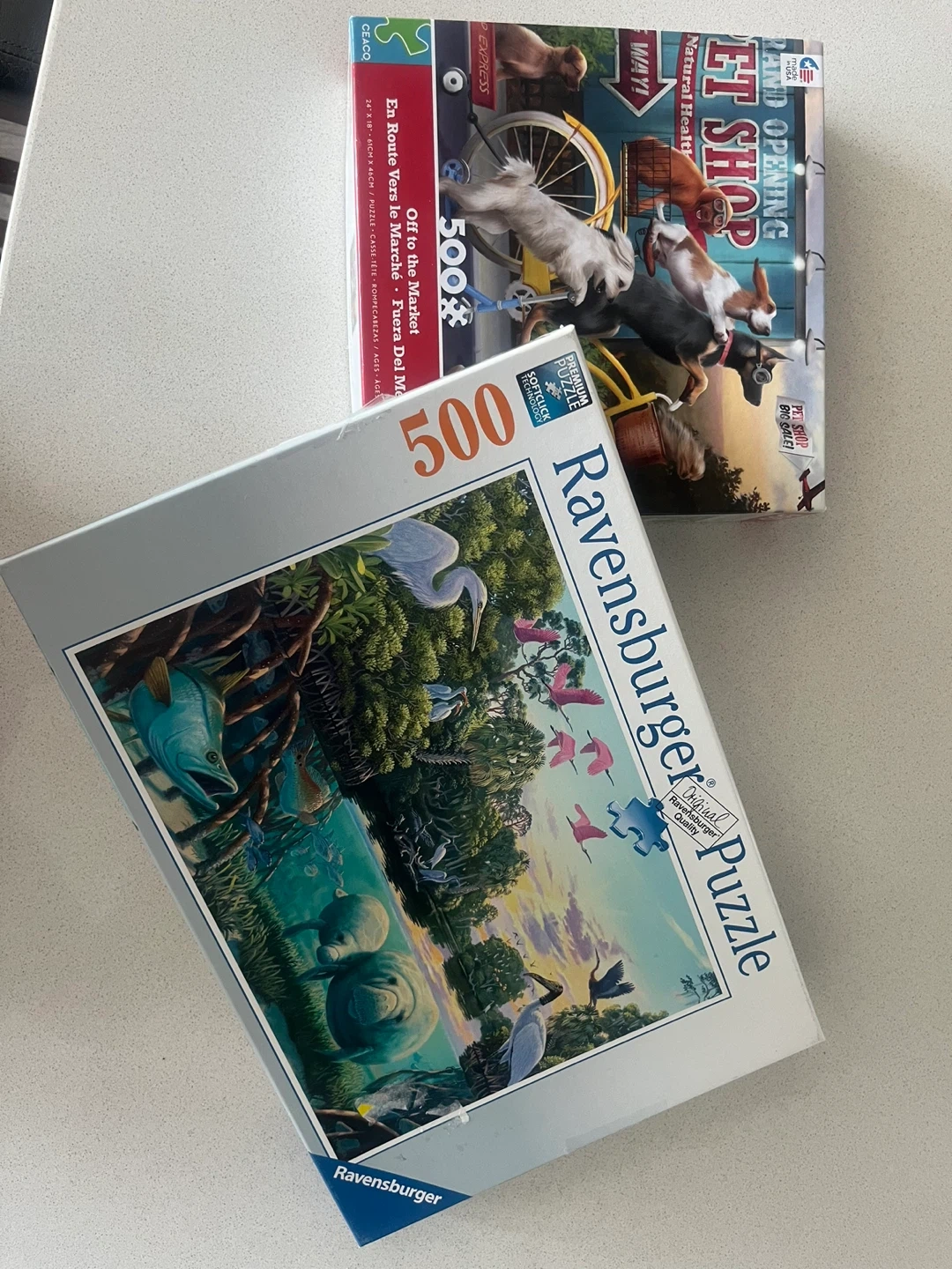 Two 500-piece Ravensburger puzzles. It depicts a serene wildlife scene with manatees and birds, and another one with dogs on bikes.