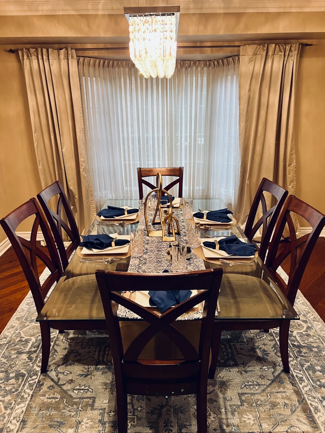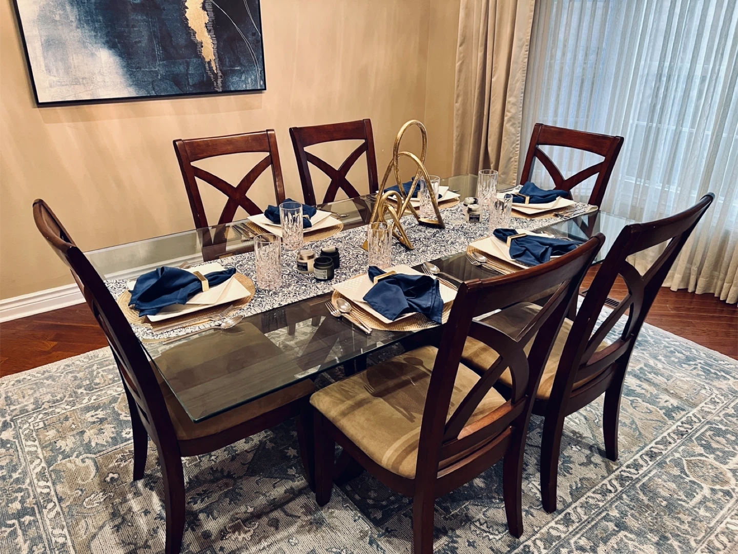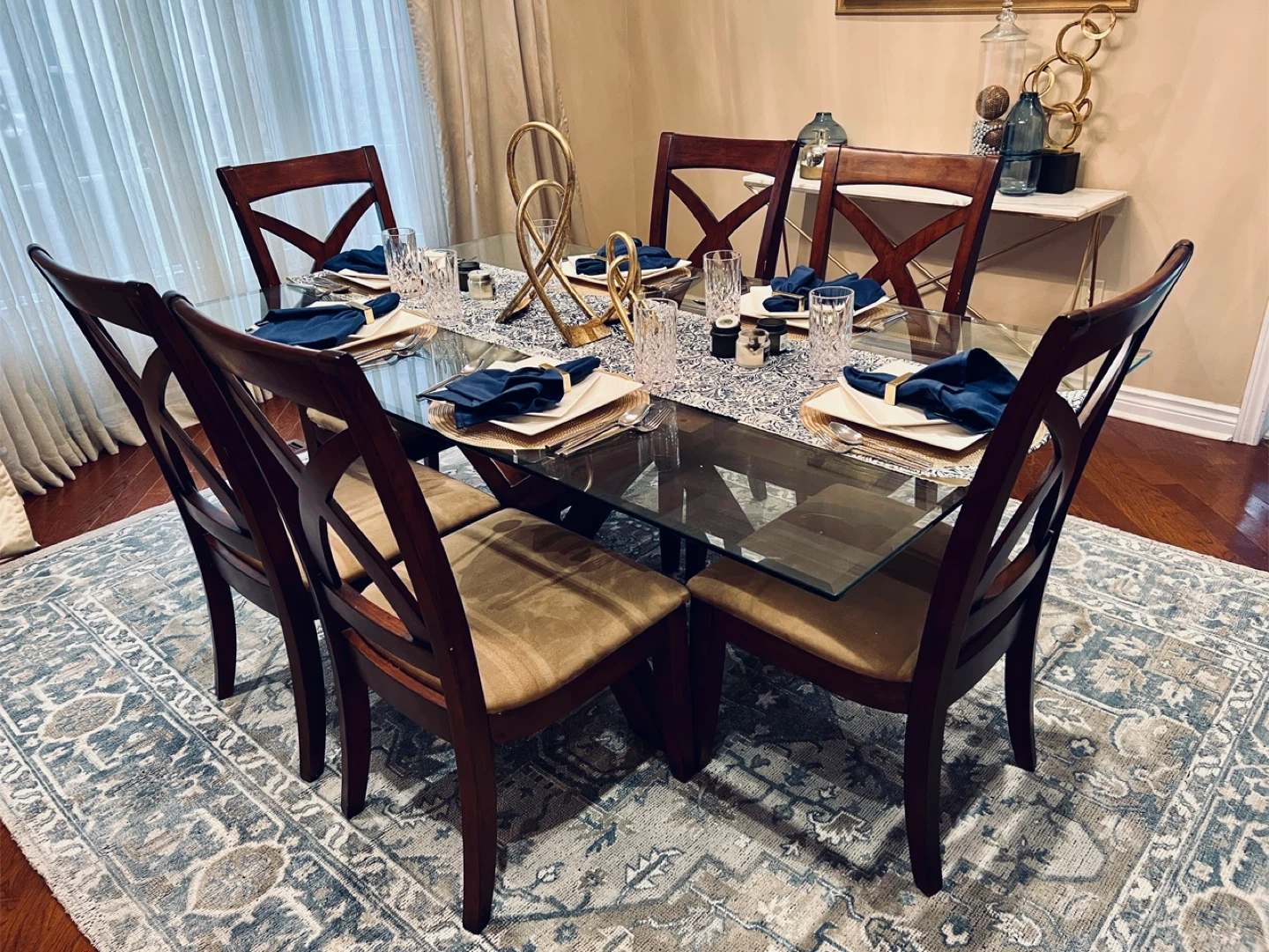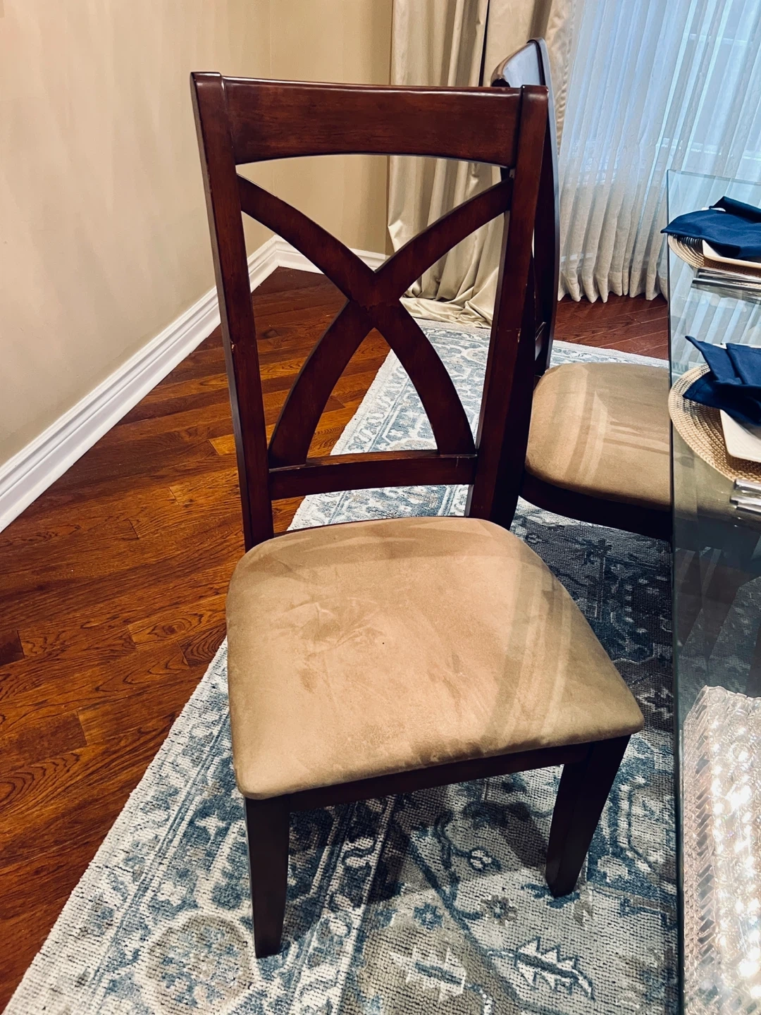 Selling a glass-top Dining table with 6 chairs, perfect for family dinners and gatherings. The chairs have a unique cross design on the back and are upholstered with a comfortable beige fabric.