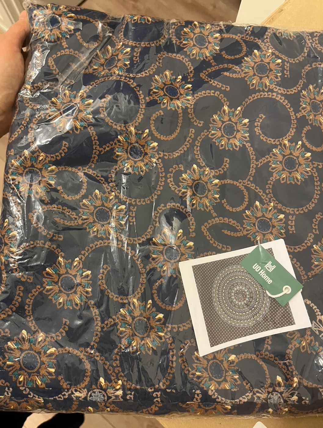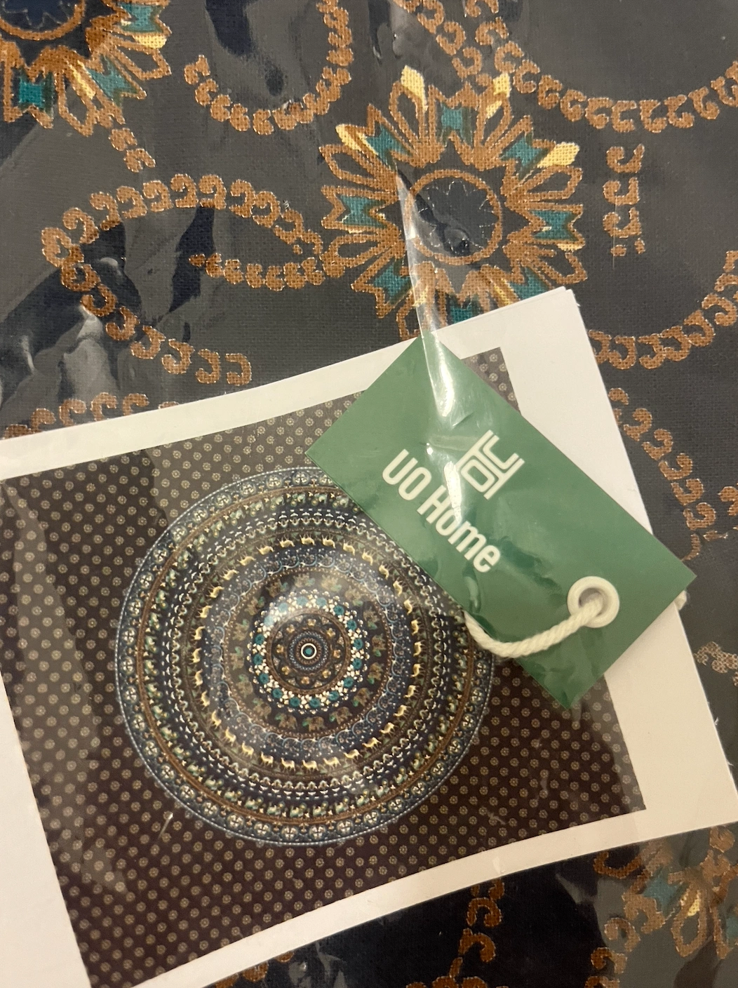 Elegant Mandala Pattern tapestry with intricate patterns. Features shades of blue, gold, and brown. Perfect for adding a touch of style to any room from the Urban Outfitters Home collection.