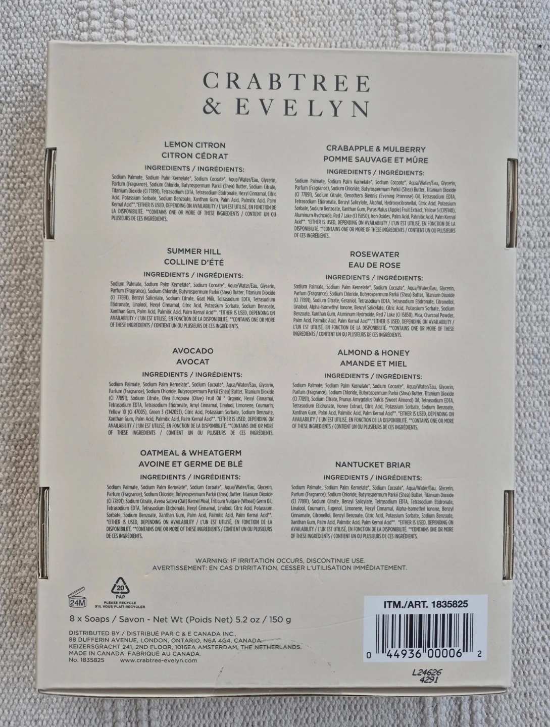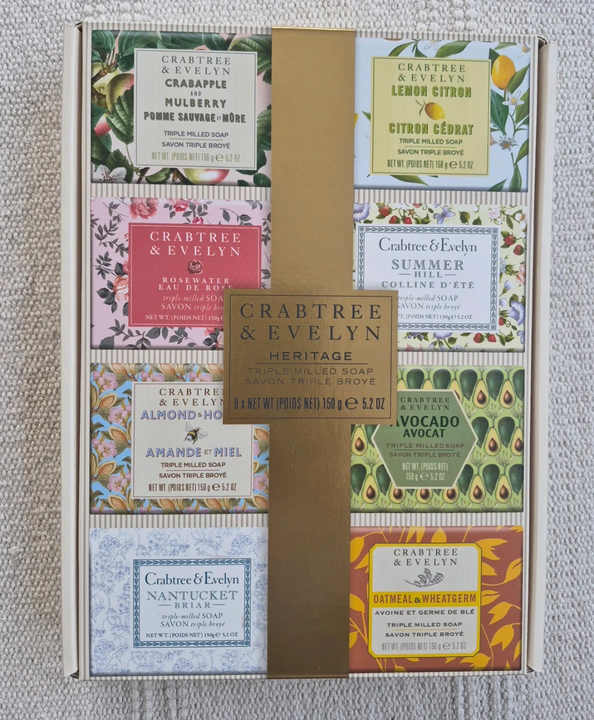 This set includes eight bars of Crabtree & Evelyn triple milled soap. Each bar is 5.2 oz (150 g). Scents include Lemon Citron, Crabapple & Mulberry, Summer Hill, Rosewater, Almond & Honey, Nantucket Briar, Avocado, and Oatmeal & Wheatgerm.