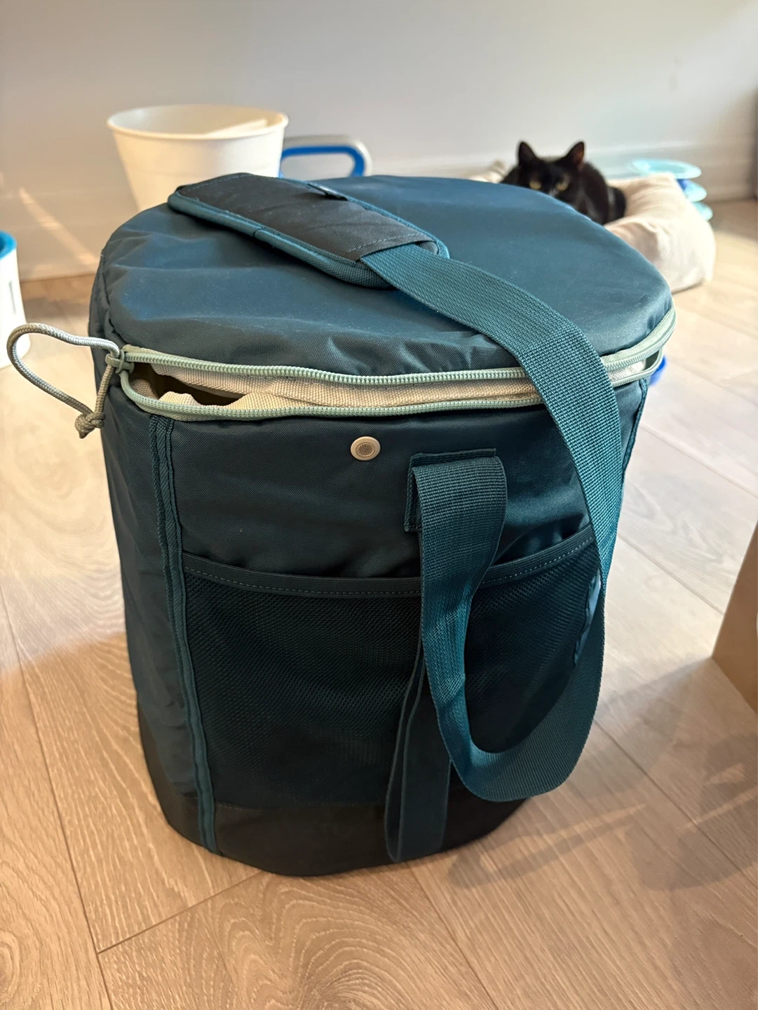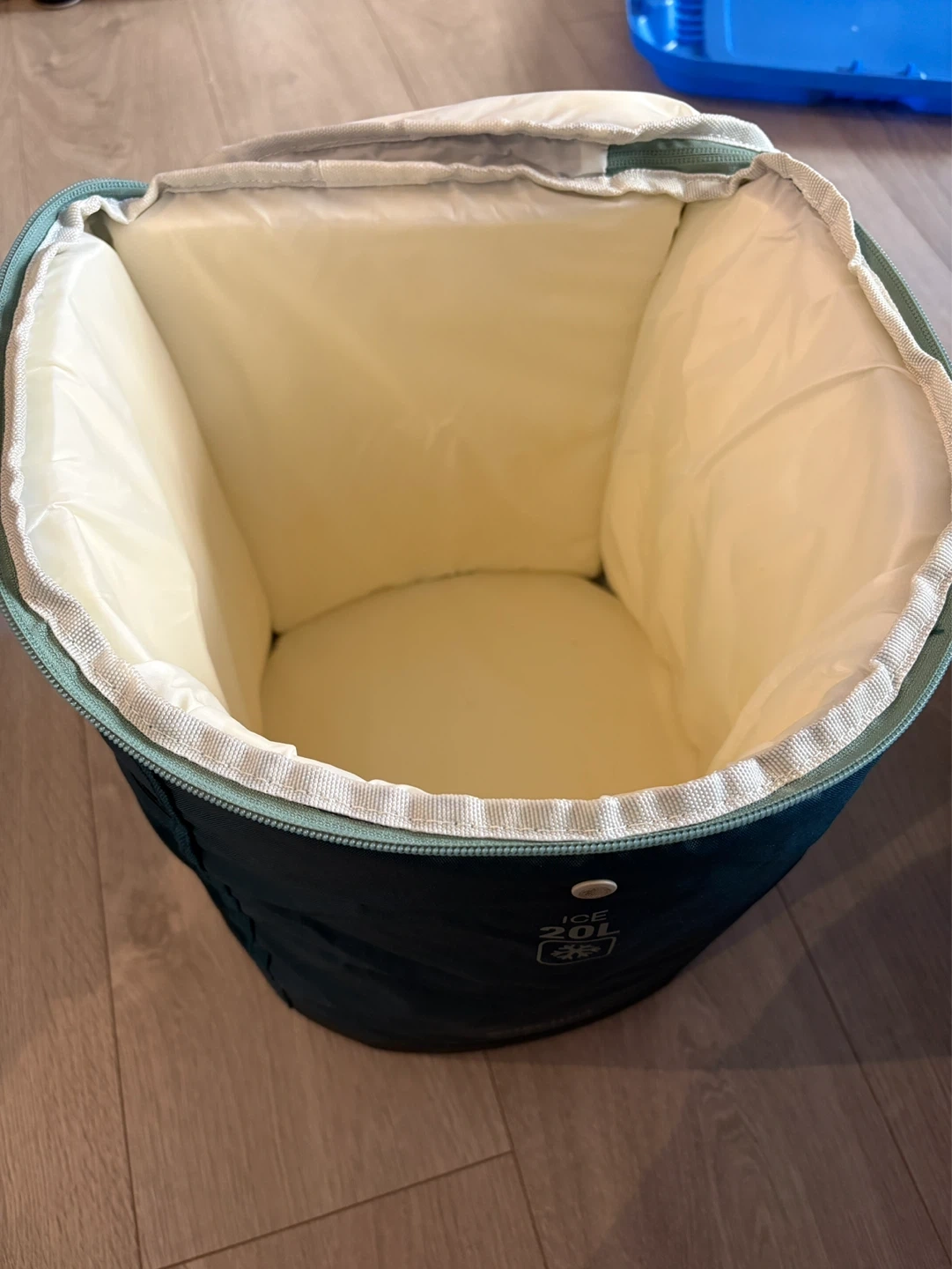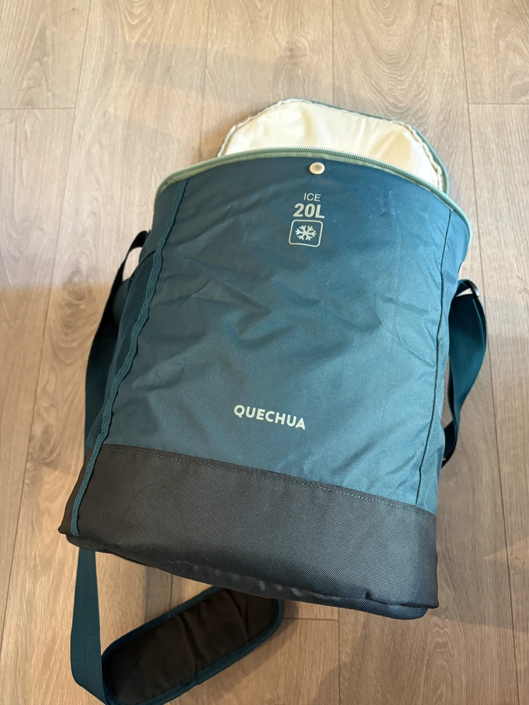 Decathlon Teal blue cooler bag with shoulder strap and mesh pockets. It's 20L capacity and insulated interior. Great for keeping drinks and snacks cold.