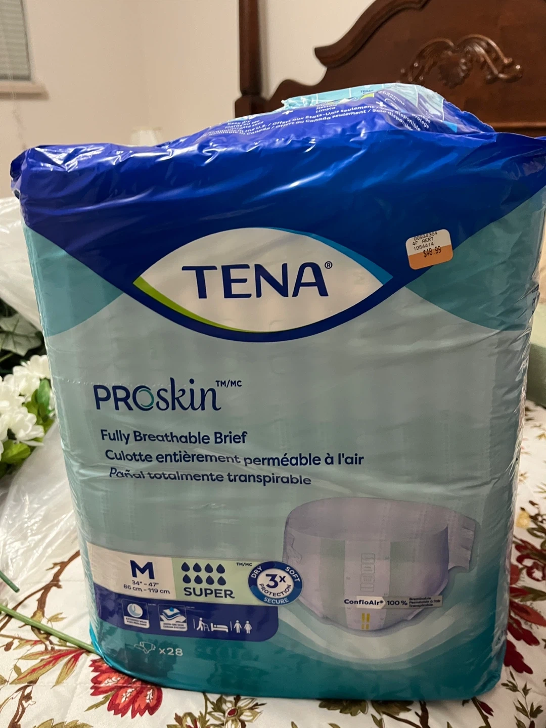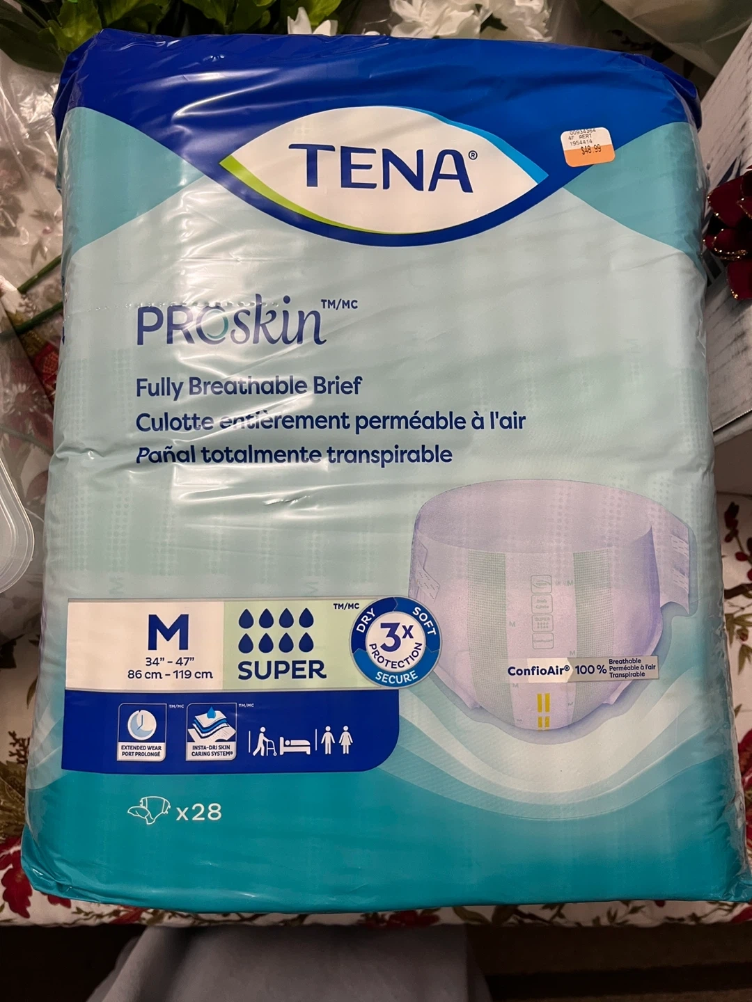 Tena Proskin Fully Breathable Briefs in size Medium. These briefs are designed for super protection and are fully breathable. Comes in a pack of 27.