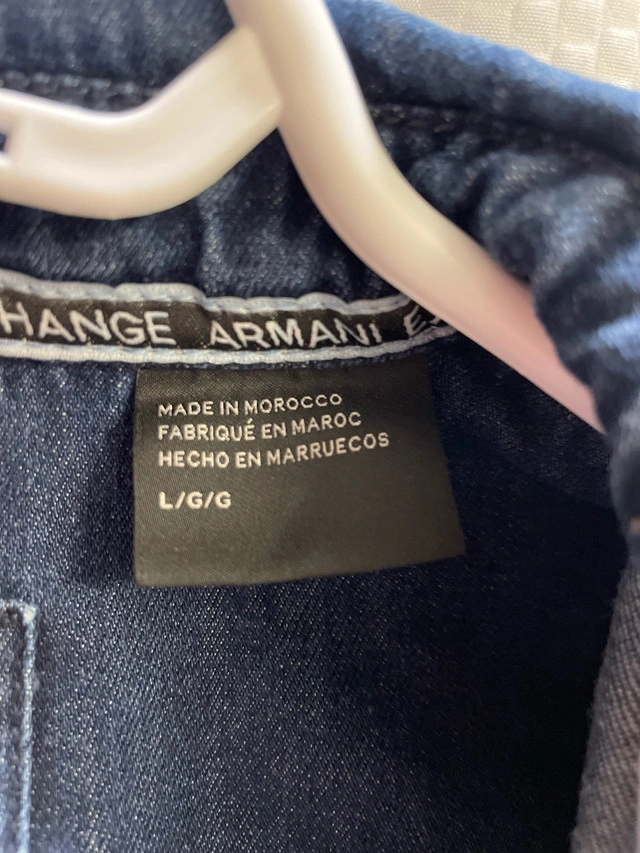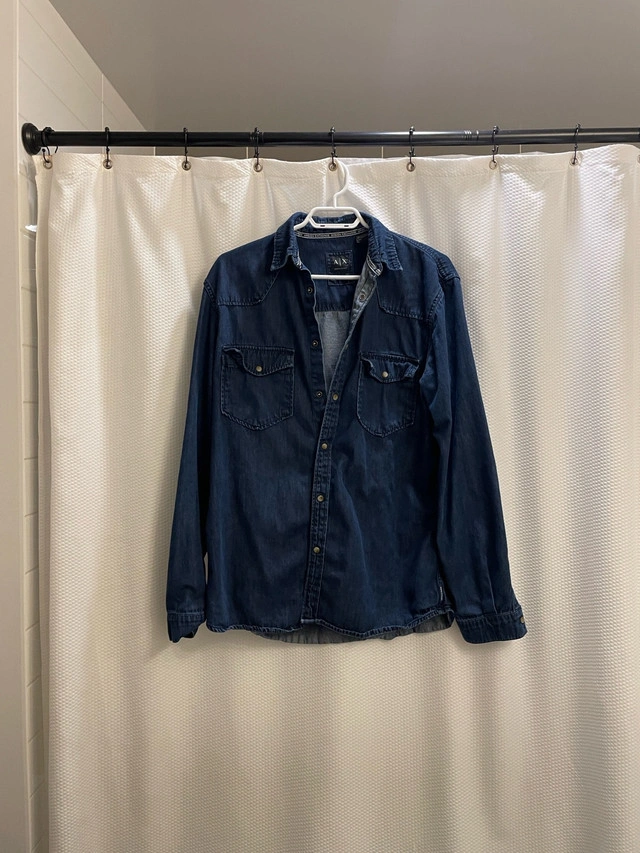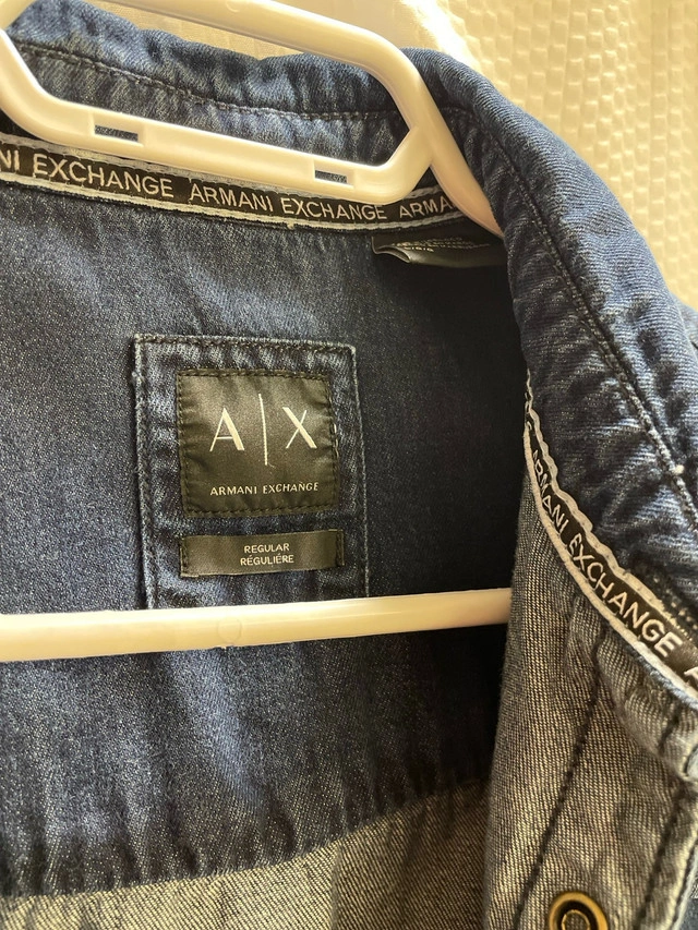 Check out this stylish Armani Exchange denim shirt in size large. It's a well-maintained fashion piece that could add a touch of sophistication to your wardrobe. It's in good condition, ready to be worn, and hoping for a new closet to call home. Specifics: * Brand: Armani Exchange * Size: Large * Material: Denim If the ad's still up, the shirt is still available!
