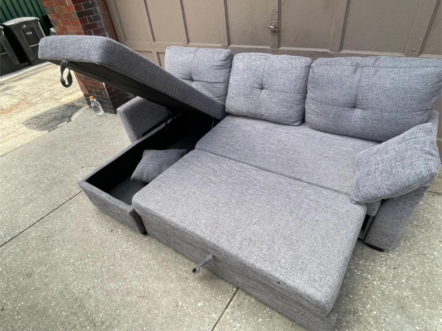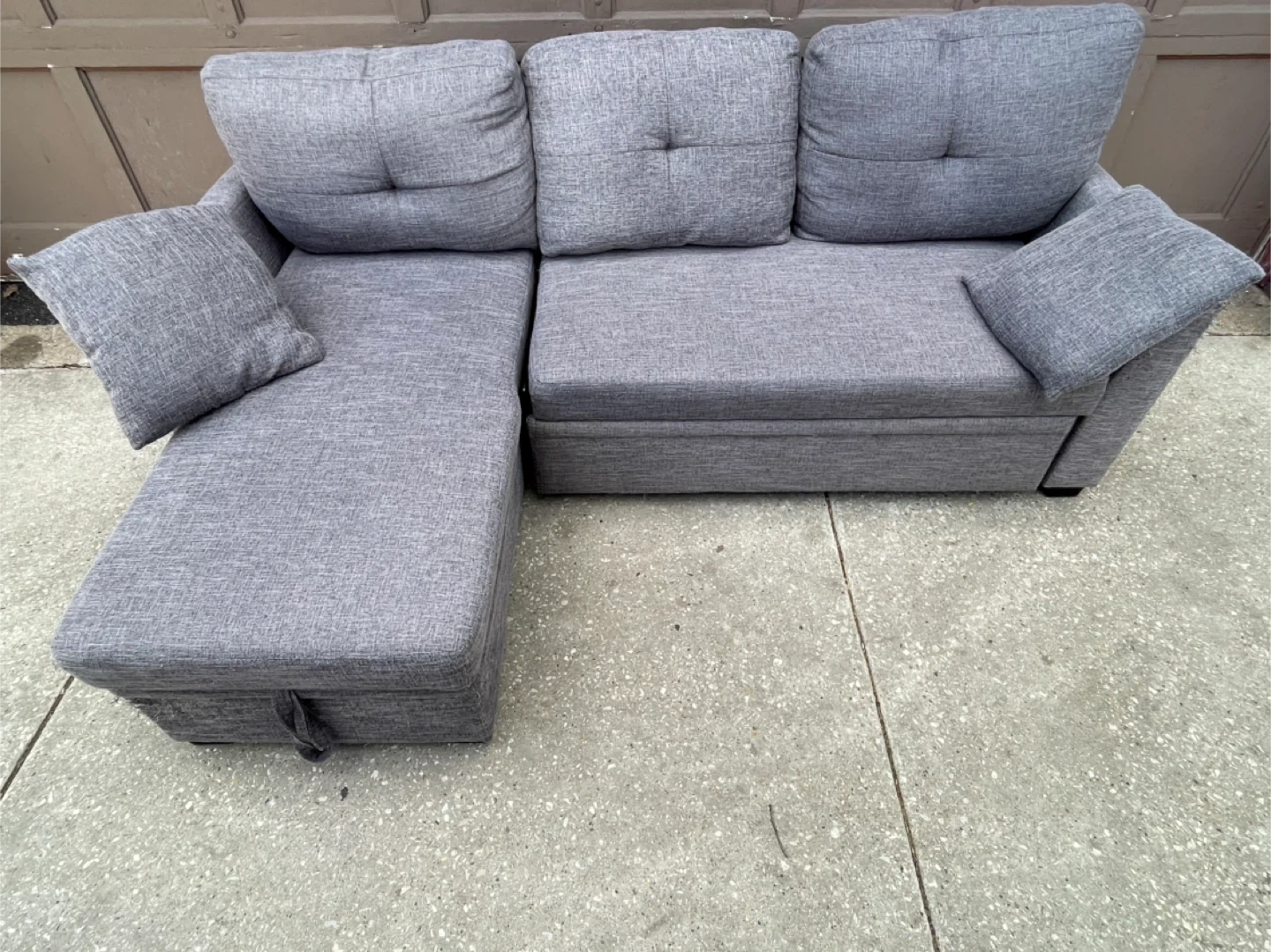 This gray sofa features a storage chaise for extra space. It has a modern design with button tufting on the back cushions. Fabric material.