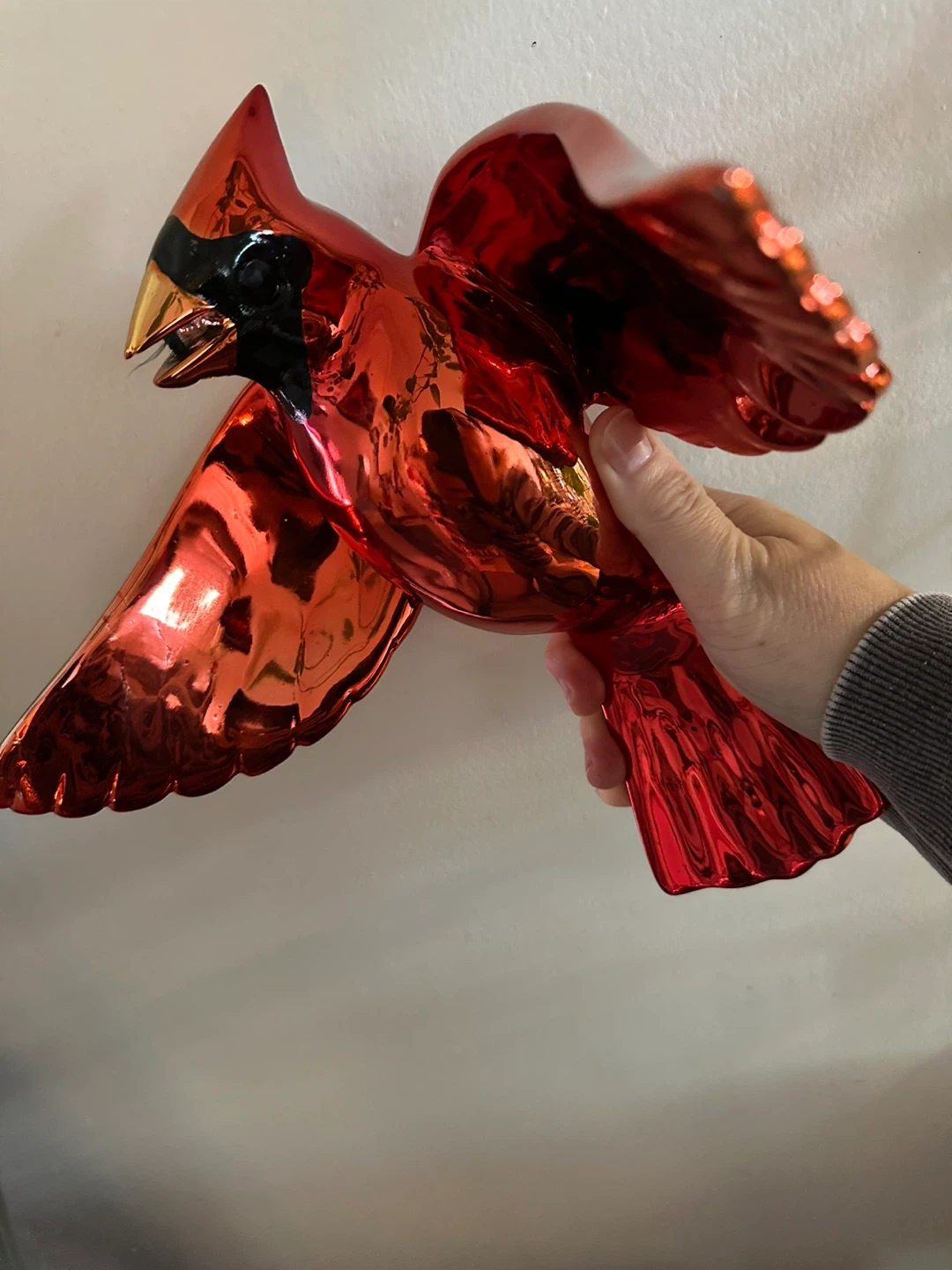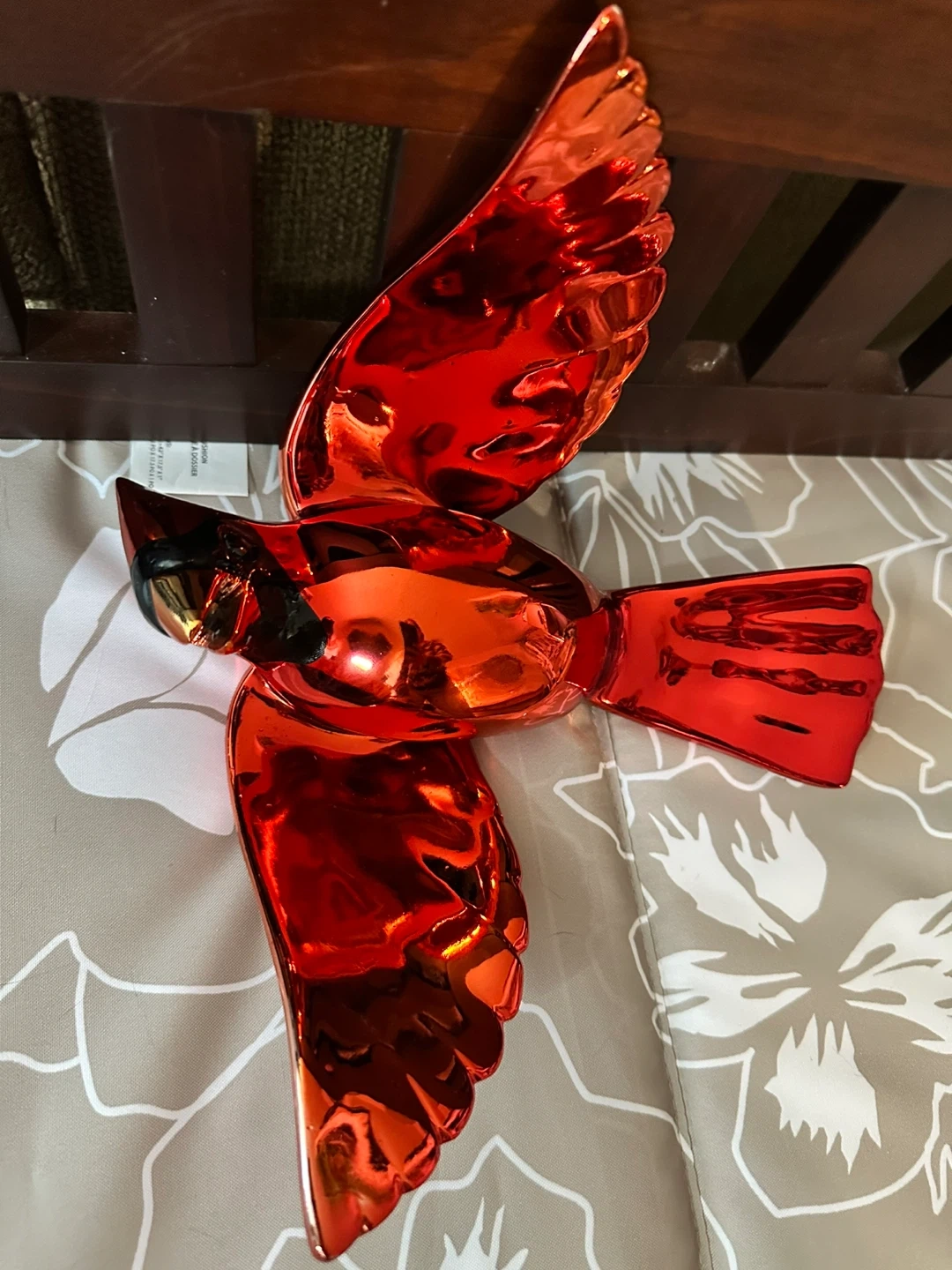 A shiny red cardinal bird figurine with metallic accents. Its vibrant colour and reflective surface make it a striking decorative piece. This decorative bird adds a touch of natural beauty to any space.