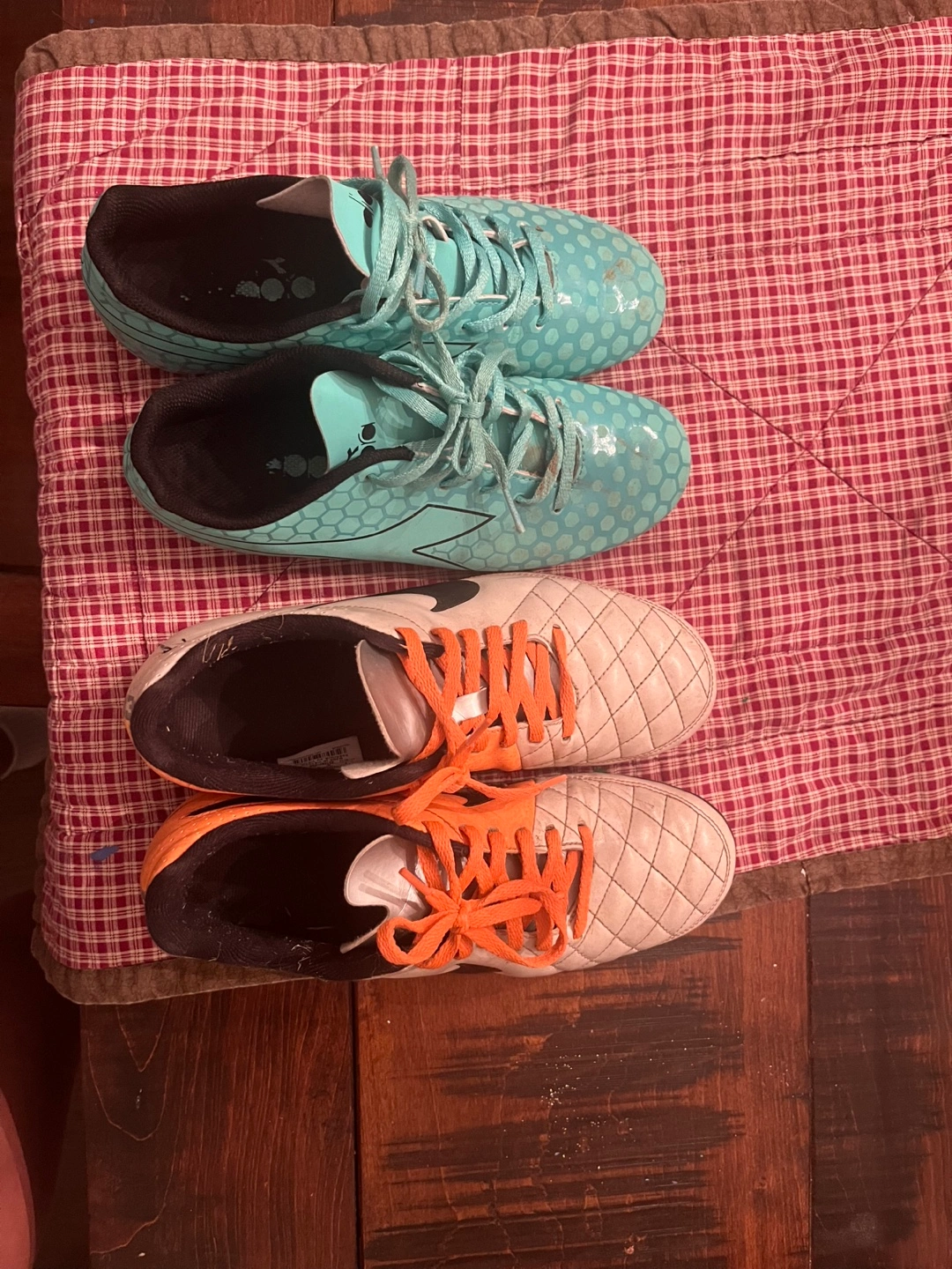 Selling a pair of Nike and Diadora soccer cleats. They're in used condition, perfect for practice or casual games. Please see photos for condition. Selling both for 35 open to offers. Teal pair is size 6 Orange pair is size 7.