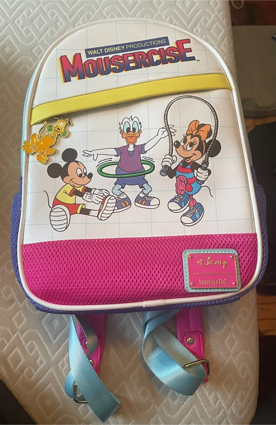 This is a cute Loungefly Disney Mousercise backpack featuring Mickey Mouse, Donald Duck, and Daisy Duck. It has adjustable shoulder straps and a zip closure