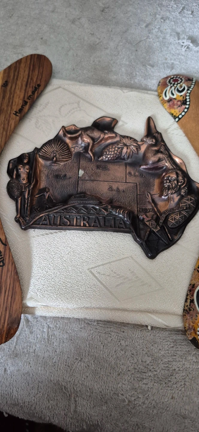Selling this Australia souvenir map. It is made of metal and has a bronze colour. It is in good condition. Can use as placing coins, keys and so on.