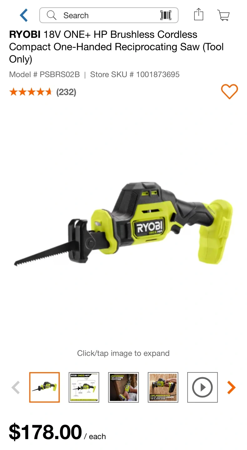 The RYOBI 18V ONE+ HP Compact Brushless One-Handed Reciprocating Saw features ONE+ HP Technology, delivering more power, runtime, durability and speed utilizing brushless motors, advanced electronics and HIGH PERFORMANCE lithium technology. RYOBI 18V ONE+ HP Compact Series tools are the lightest and most compact tools RYOBI offers, while still delivering the power to get the job done. Easily make aggressive cuts up to 2X faster than the previous generation with speeds up to 3,200 SPM and a 7/8" stroke length. The rapid release blade change allows for quick blade swaps by twisting to eject the old blade and simply inserting the new one without additional twists or tools. This one-handed recip saw features a variable speed trigger for more control and precise cuts through any material.