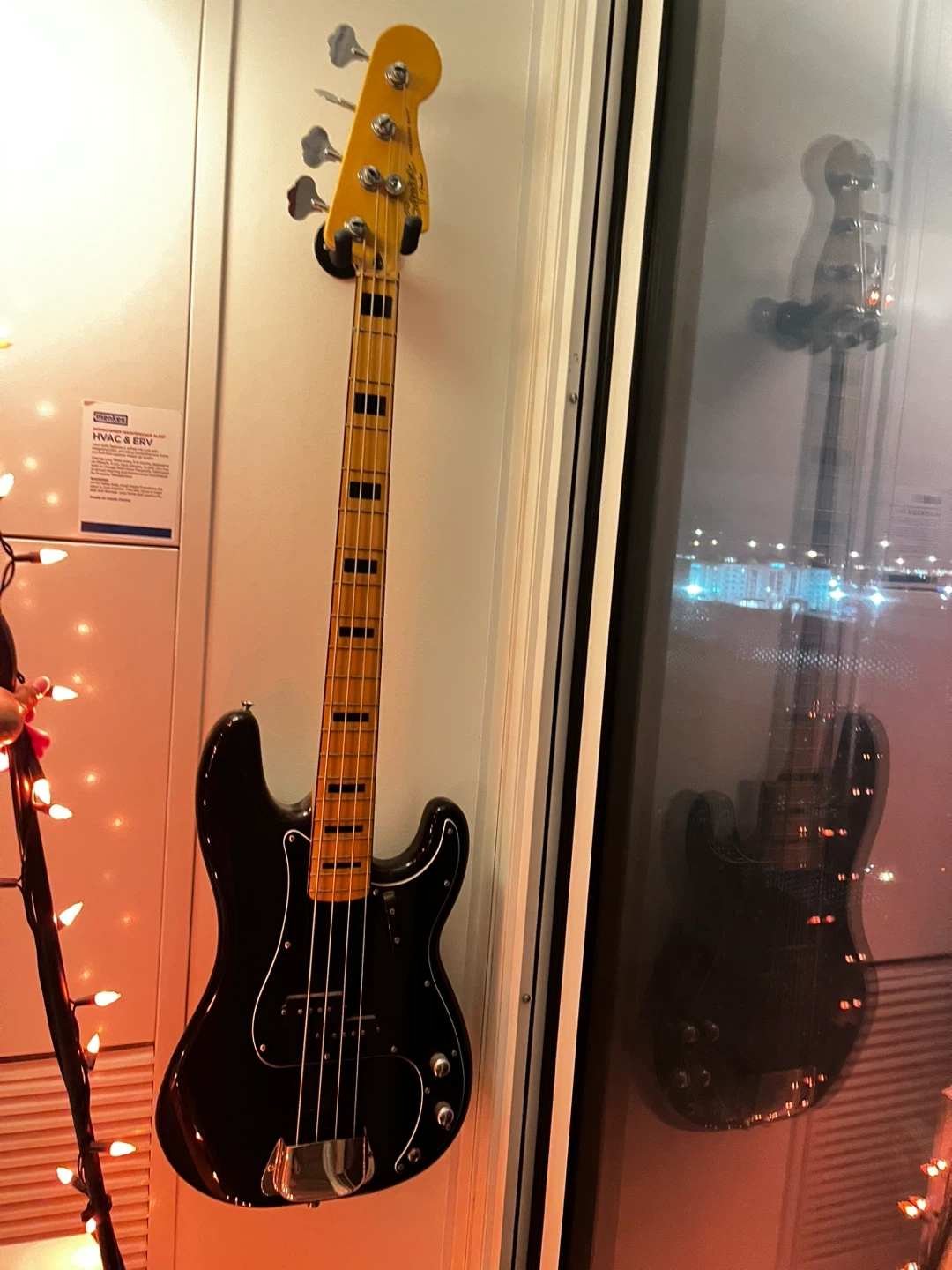 This is a Squier Precision Bass guitar. It's black with a maple neck. Great for any musician! Only used for a month, can sell with bass too. Dm me for more info.