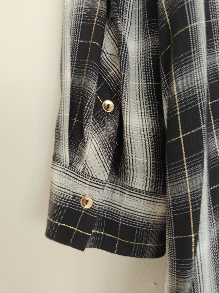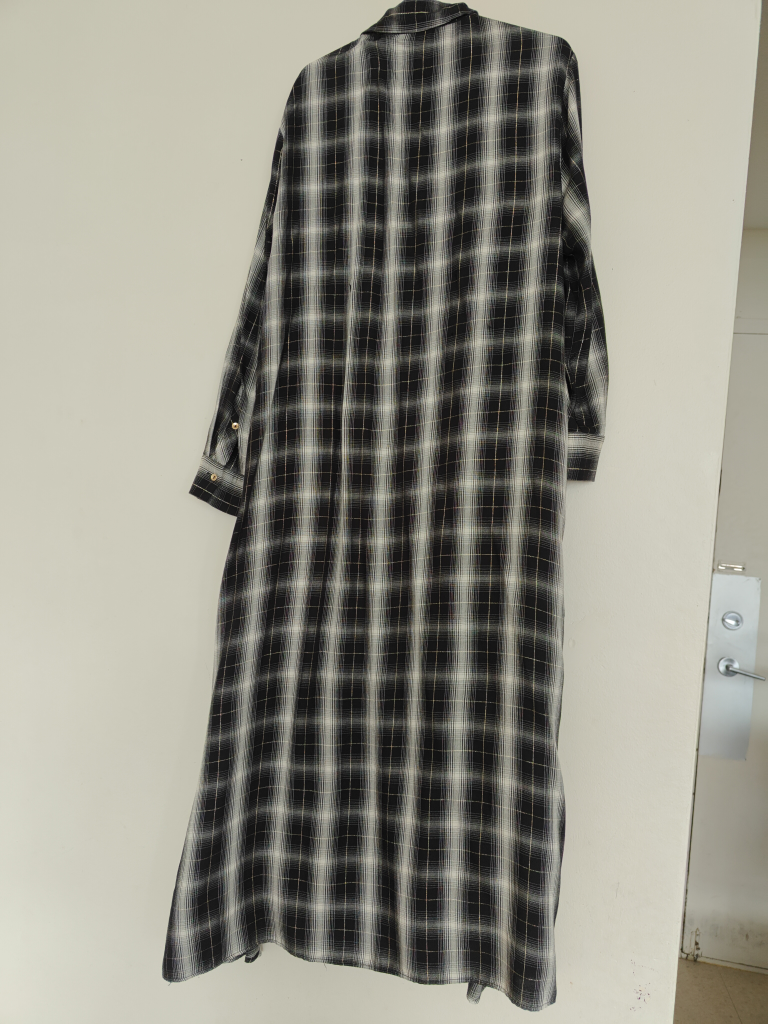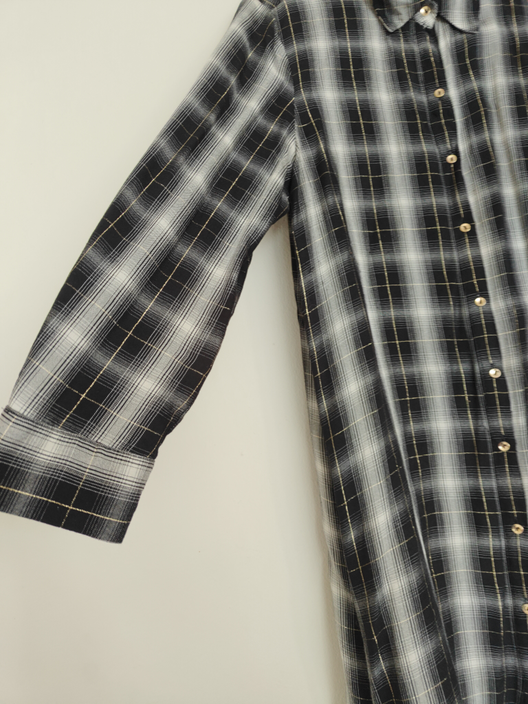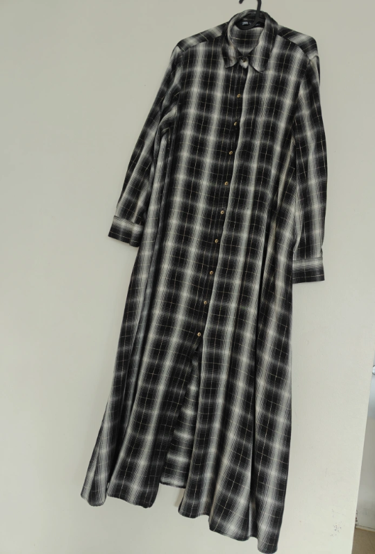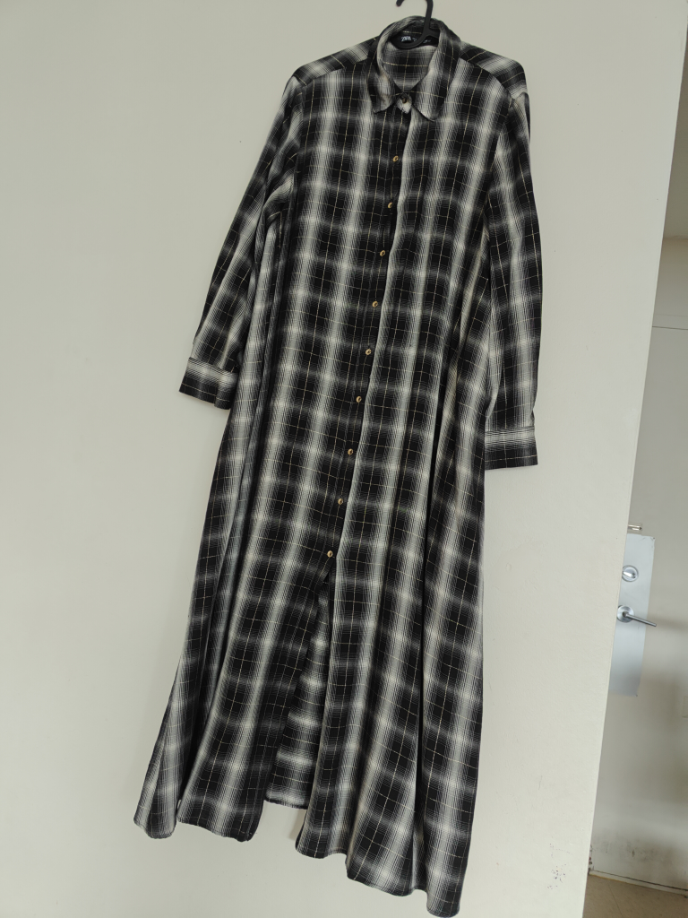 Selling a Zara plaid maxi shirt dress! It features a black and white plaid pattern with gold accents. Perfect for a casual or dressed-up look