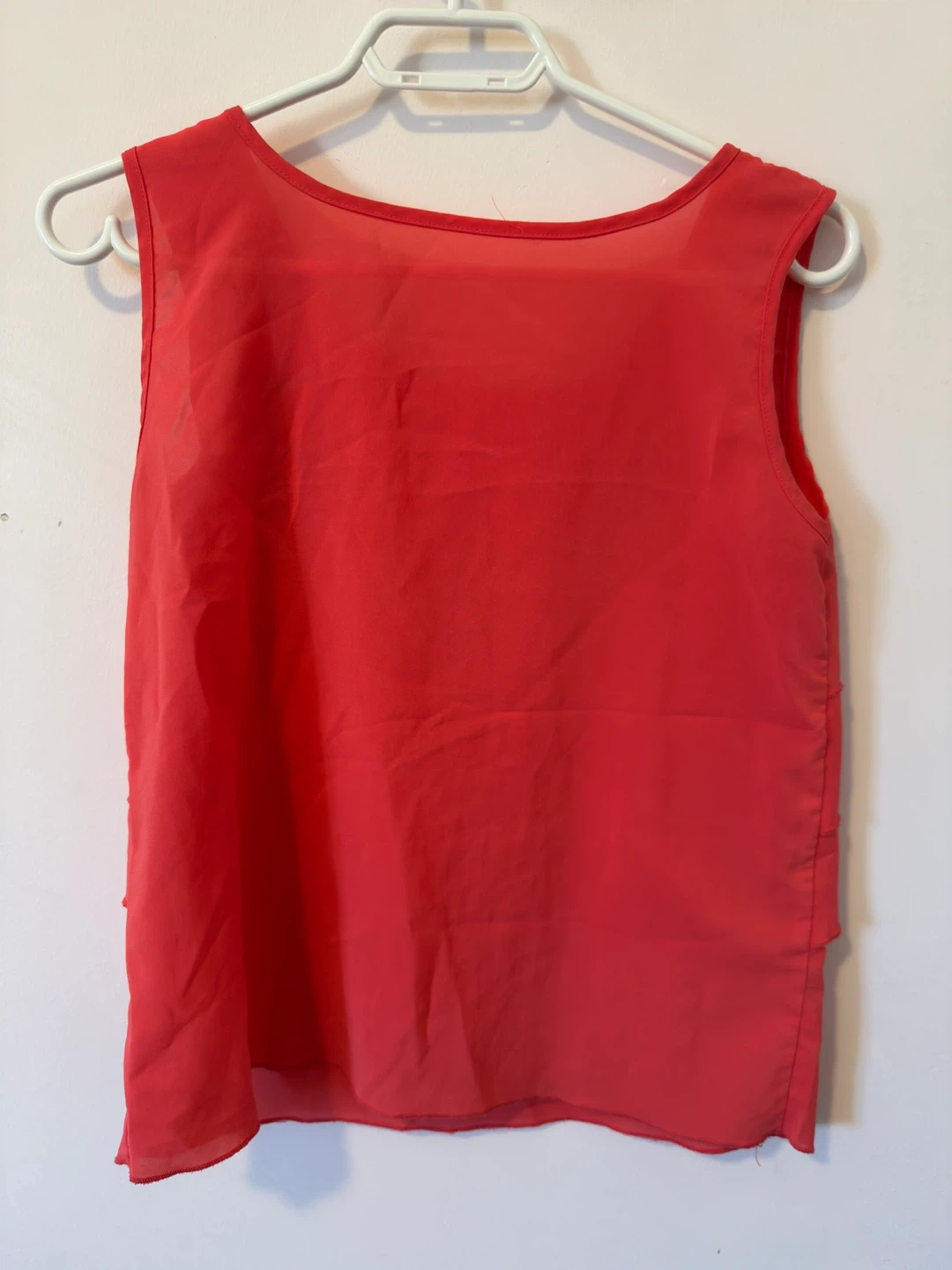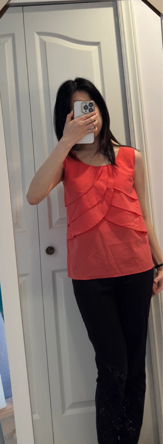 Coral sleeveless tank top. Features a layered ruffle design on the front. Sheer overlay with solid lining. Perfect for warmer weather!