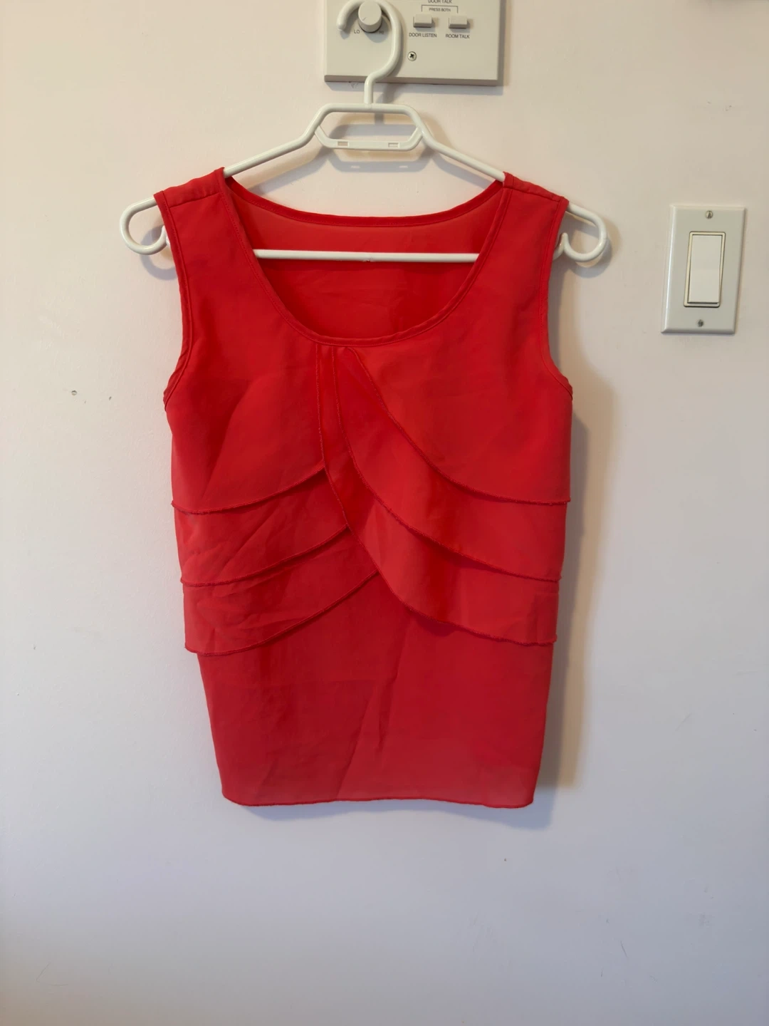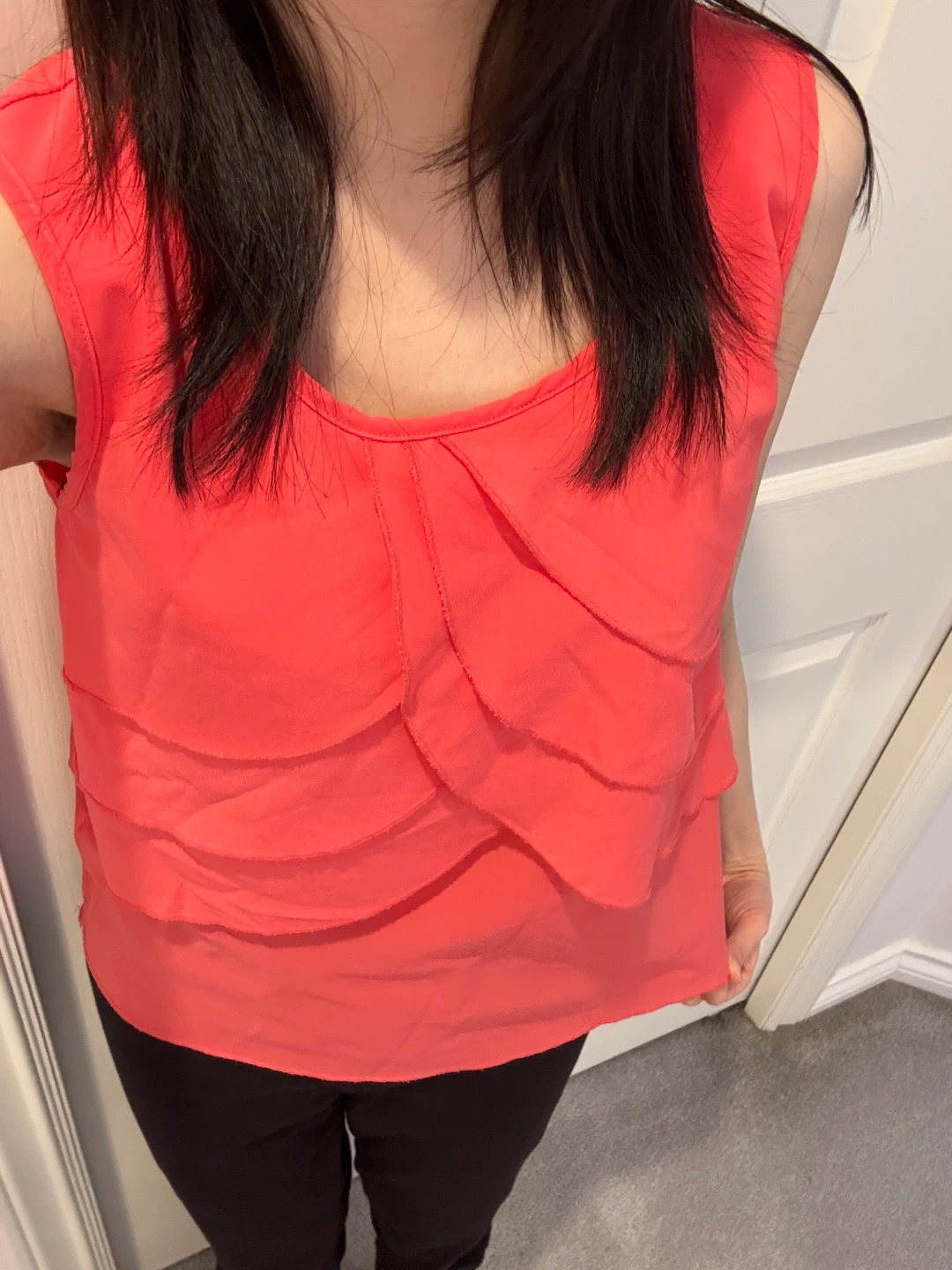 Coral sleeveless tank top. Features a layered ruffle design on the front. Sheer overlay with solid lining. Perfect for warmer weather!