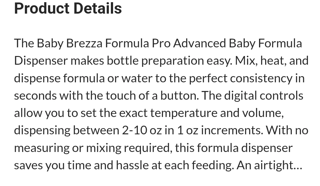 This Baby Brezza Formula Pro Advanced dispenser makes bottle prep easy. Mix, heat, and dispense formula or water to the perfect consistency in seconds. Digital controls let you set the exact temperature and volume, dispensing between 2-10 oz in 1 oz increments. No measuring or mixing required!
