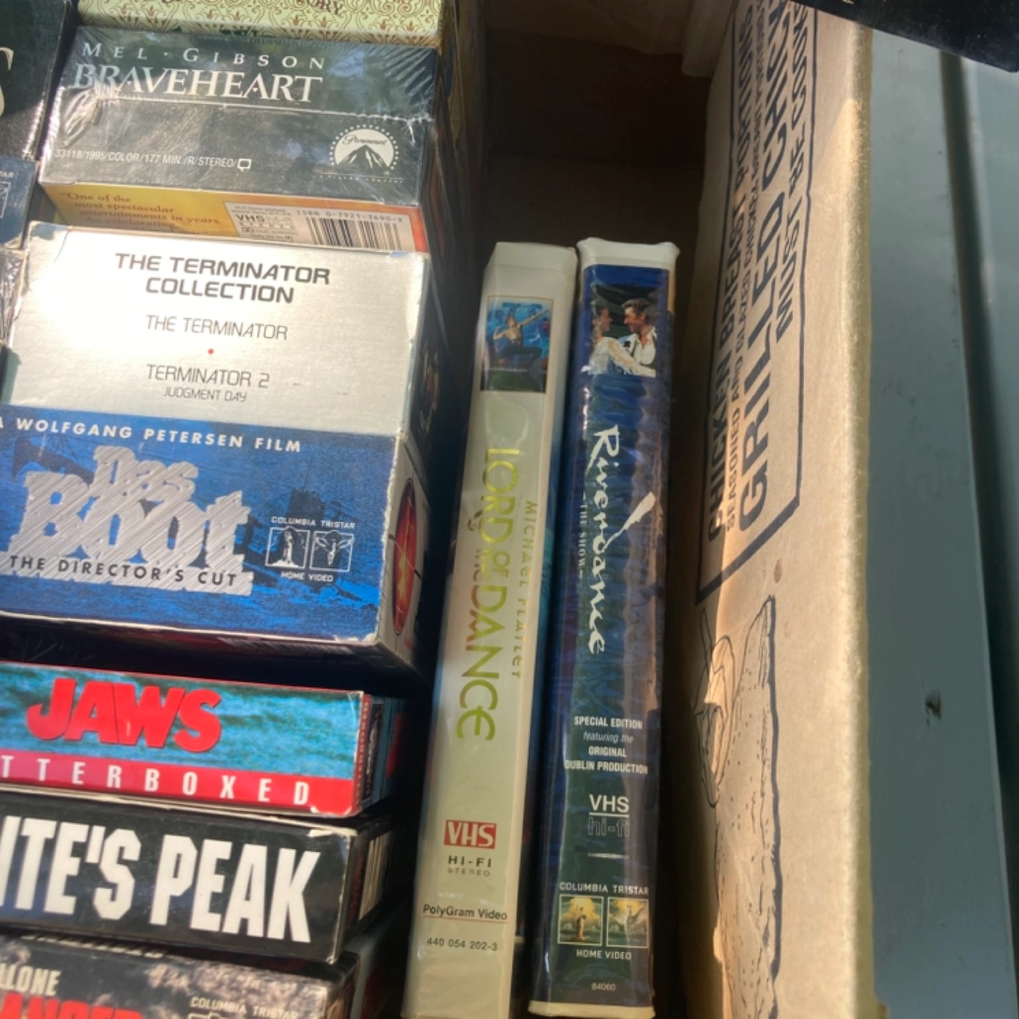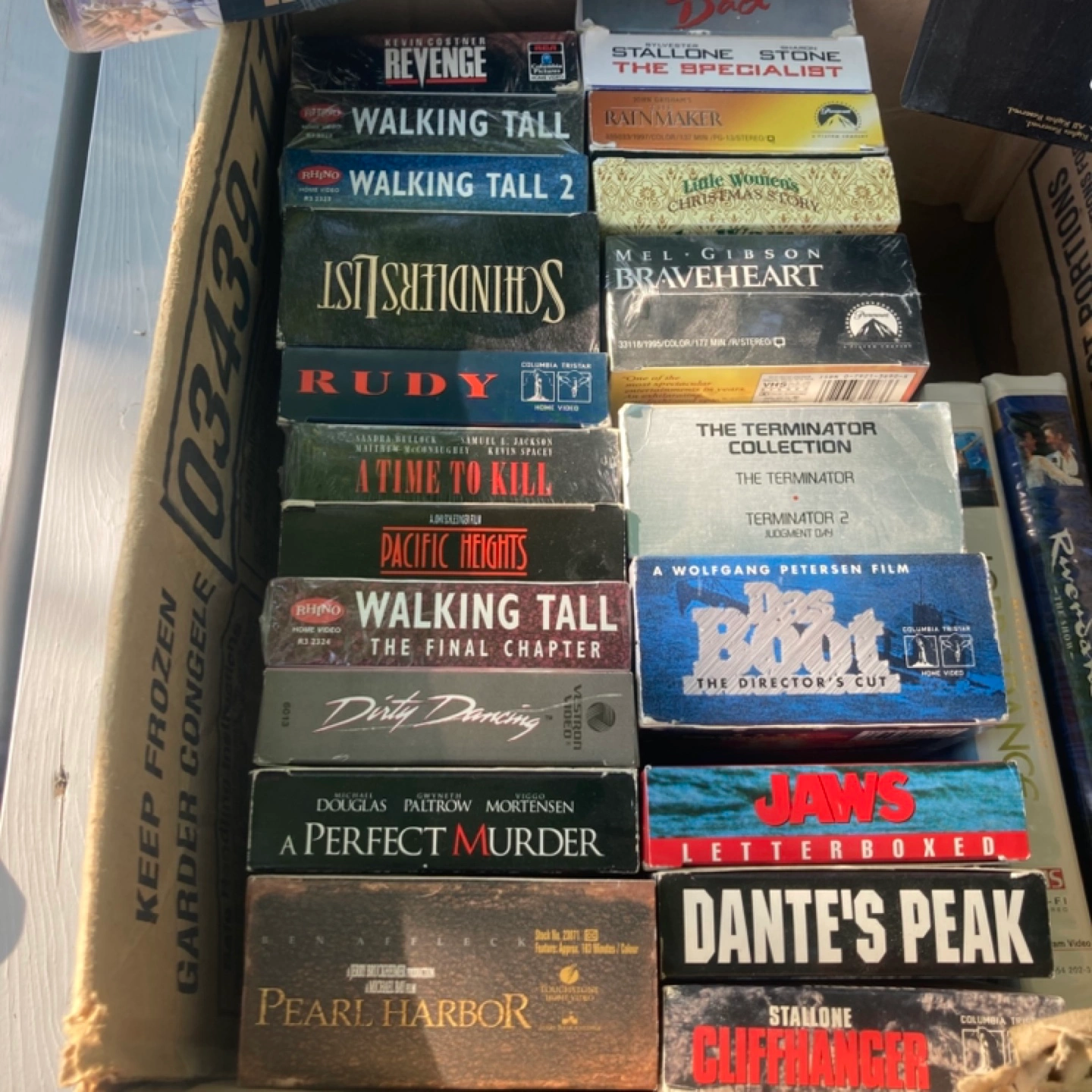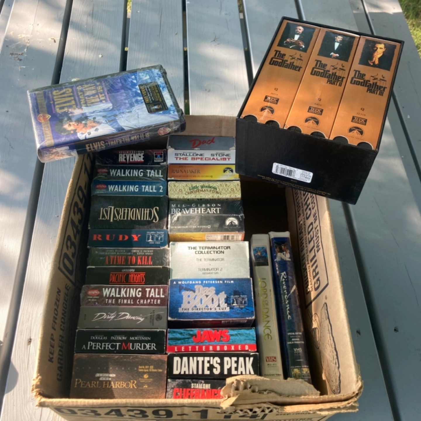 Large collection of VHS tapes. Includes The Godfather trilogy, various action, drama, and thriller films. Great for collectors or movie lovers. Some cases show wear so are new factory sealed