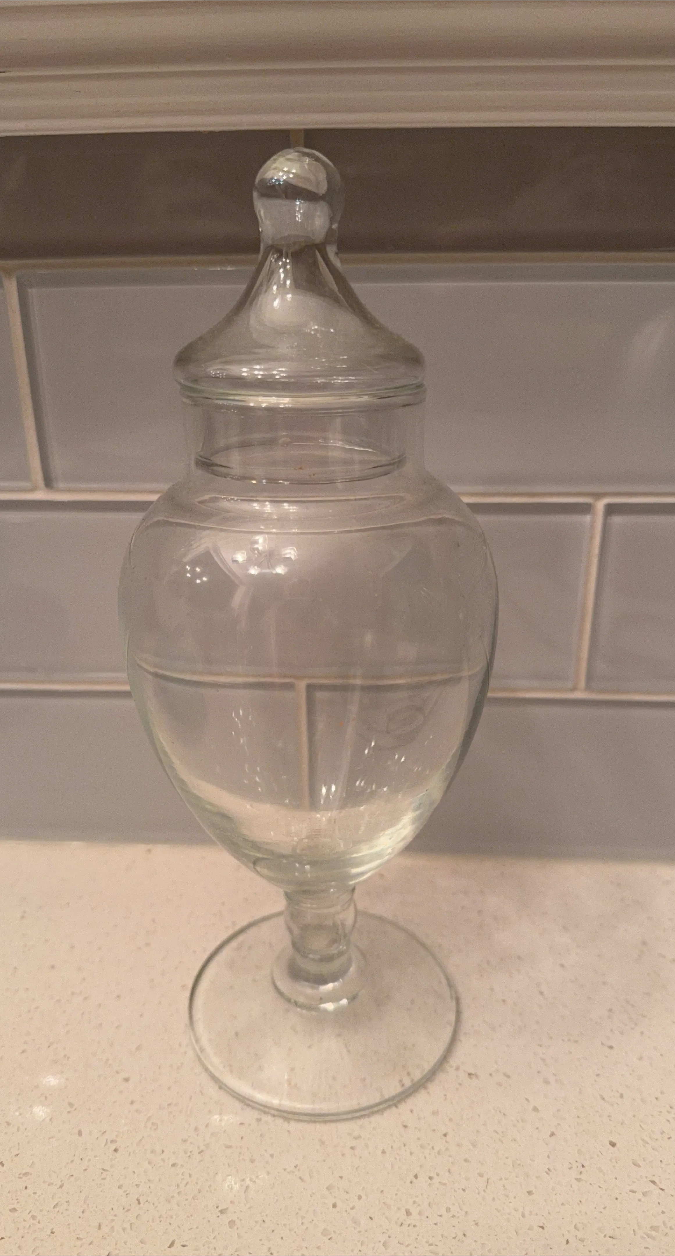 A clear glass apothecary jar with a decorative lid. It's perfect for storing candies, cotton balls, or other small items. The glass construction makes it easy to clean.