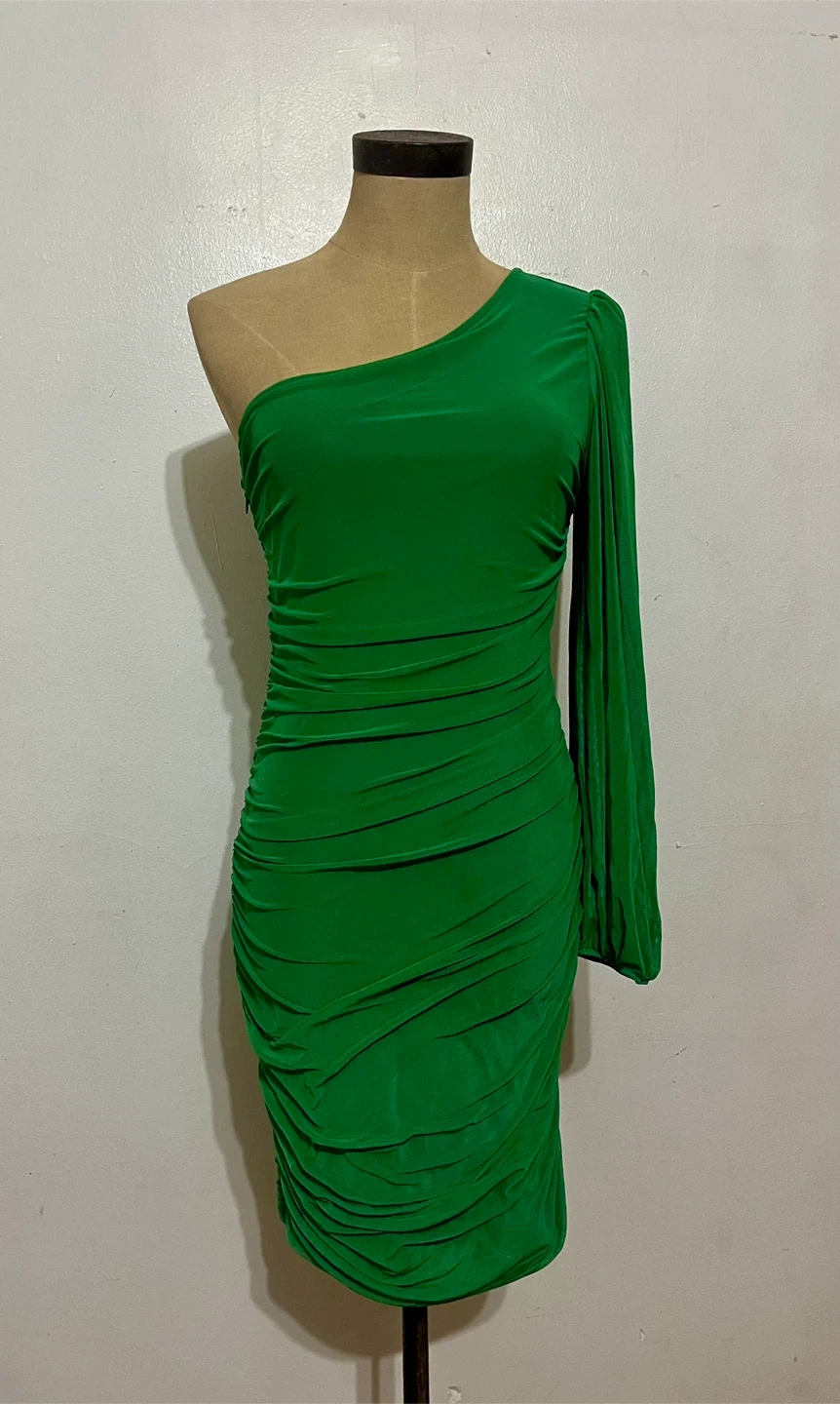 A vibrant green one-shoulder dress with ruched detailing. This dress features a full-length sheer, puff sleeve on one side and a bodycon fit. It's made from a stretchy polyester blend. Great for a night out and perfect for spring/summer.