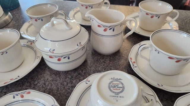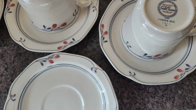 Tea set includes 7 cups, 8 saucers, creamer, and sugar bowl. Floral design. Excellent condition. One saucer has a small chip on the edge, included as a spare. The other 7 cup and saucer sets, along with the sugar and creamer, are in perfect condition. Pick up in the Lisgar area of Mississauga. Replacement value: sugar container with lid=$25, creamer=$25, cup and saucer set=$10-$12 each x 7 pcs = at least $70. Best replacement price is $120.