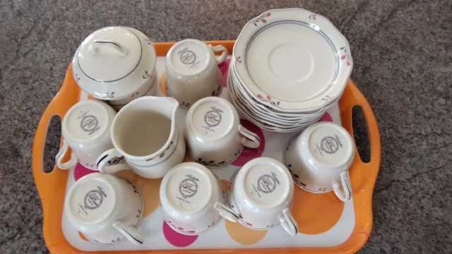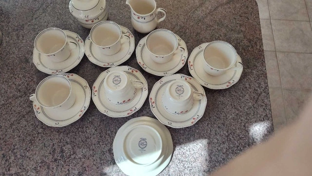 Tea set includes 7 cups, 8 saucers, creamer, and sugar bowl. Floral design. Excellent condition. One saucer has a small chip on the edge, included as a spare. The other 7 cup and saucer sets, along with the sugar and creamer, are in perfect condition. Pick up in the Lisgar area of Mississauga. Replacement value: sugar container with lid=$25, creamer=$25, cup and saucer set=$10-$12 each x 7 pcs = at least $70. Best replacement price is $120.