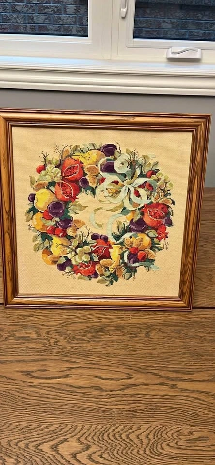 Beautiful framed cross stitch art with a colorful fruit and flower wreath design. The frame is wood. Great for adding a cozy touch to any room.