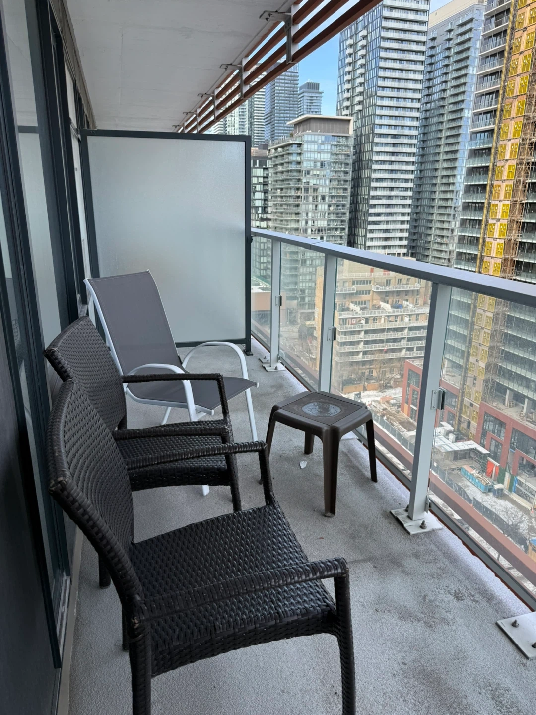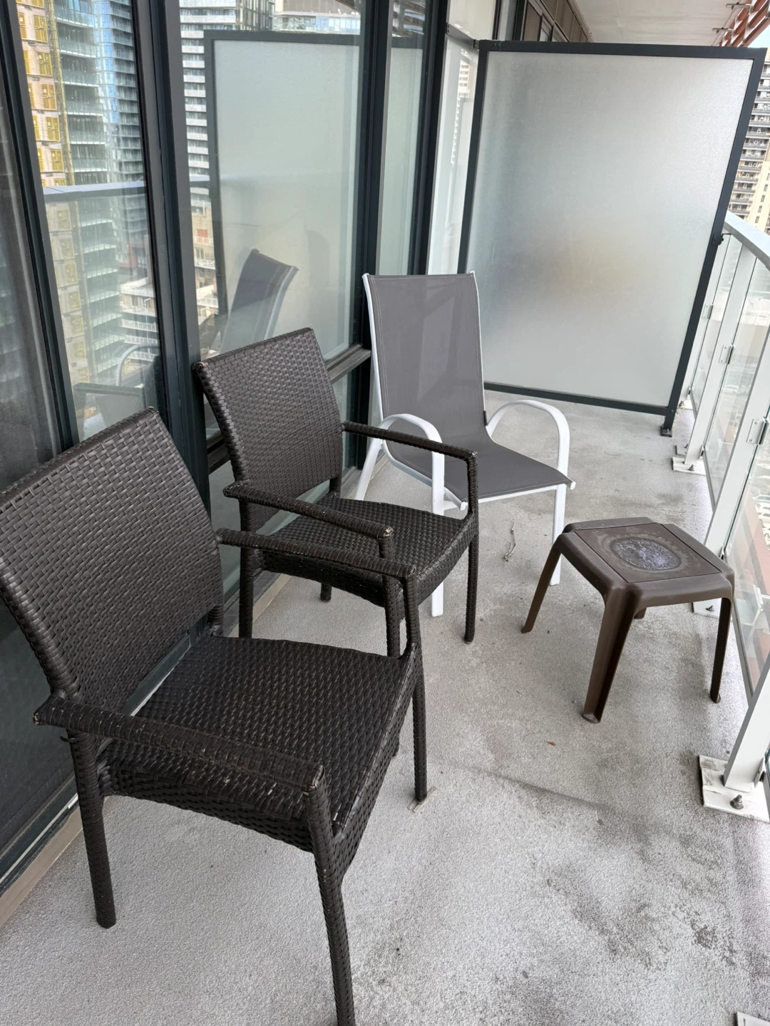 This set includes two dark brown wicker-style patio chairs and a white and grey sling-back lounger chair. A small brown plastic side table is also included. It's perfect for enjoying your balcony or patio space!