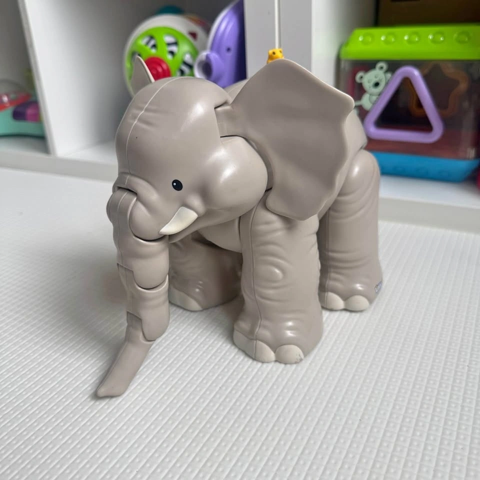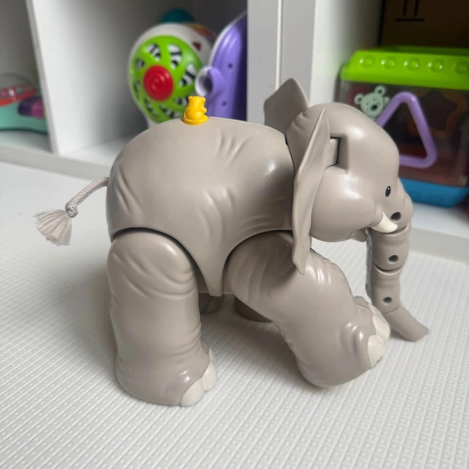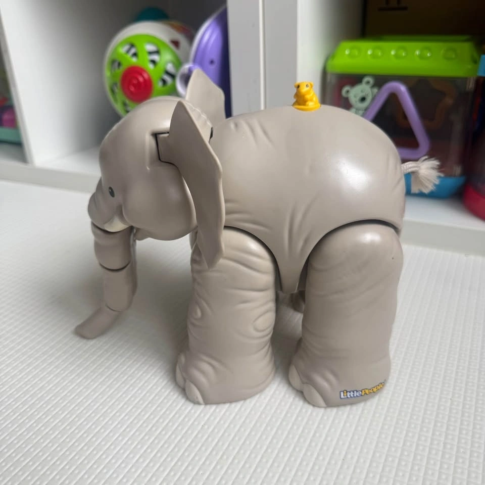 Cute gray Little People elephant toy. Has articulated legs and trunk. Little yellow duck is on its back. Has a rope tail. Makes sound. Pick up in Richmond Hill.