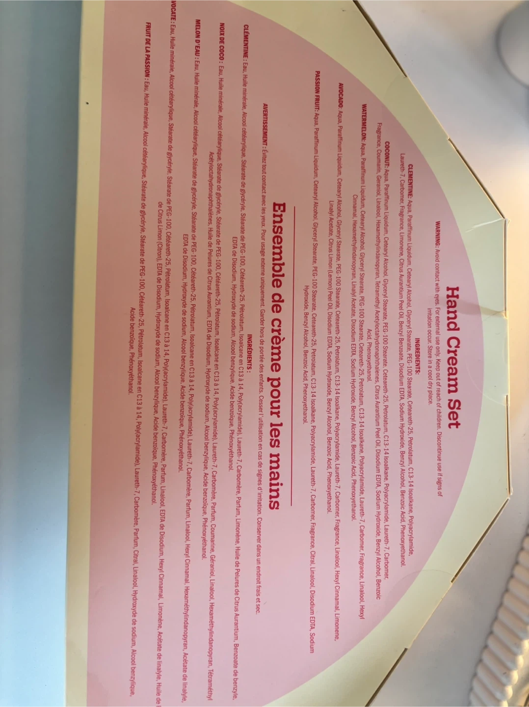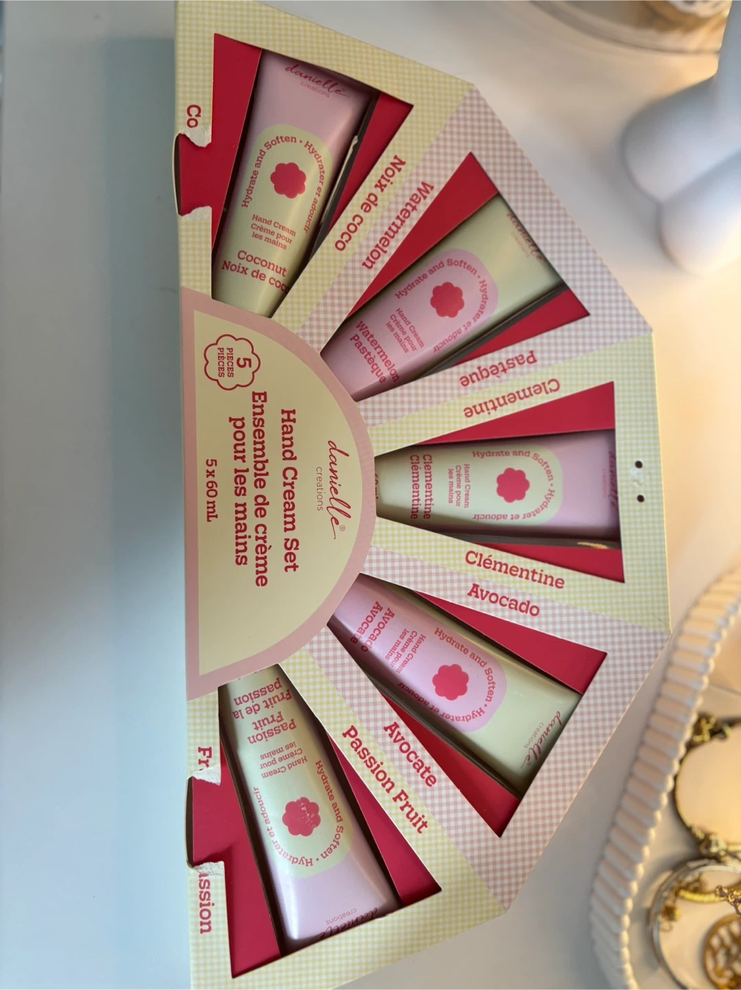 A set of 5 hand creams, each 60ml. Includes Coconut, Watermelon, Clementine, Avocado, and Passion Fruit scents. Hydrates and softens skin. Great for everyday use!