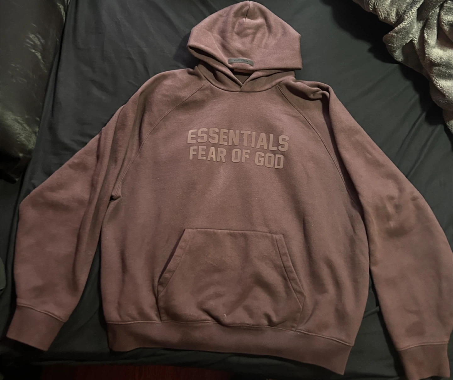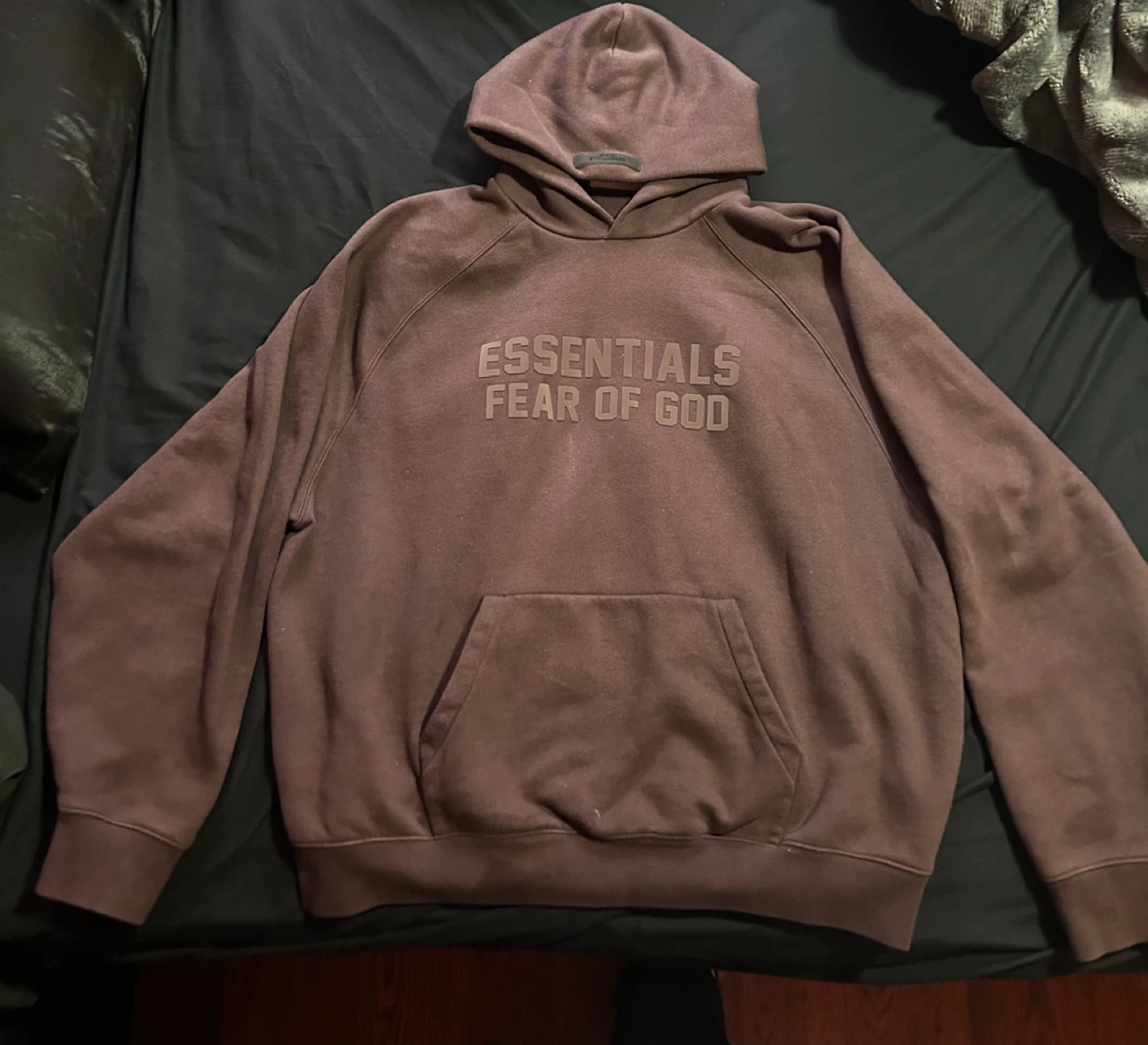 This is a brown hoodie from Fear of God Essentials. It features a front pocket and a drawstring hood. Made with a comfortable fabric blend.