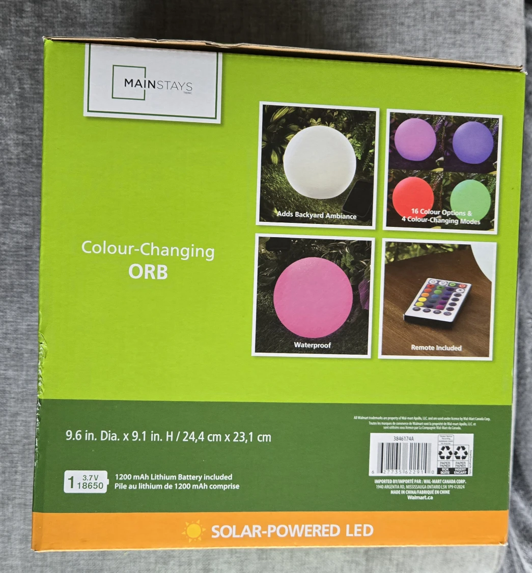 Selling a brand new Mainstays Colour-Changing Orb! It's still in its original box and ready to add some backyard ambiance.