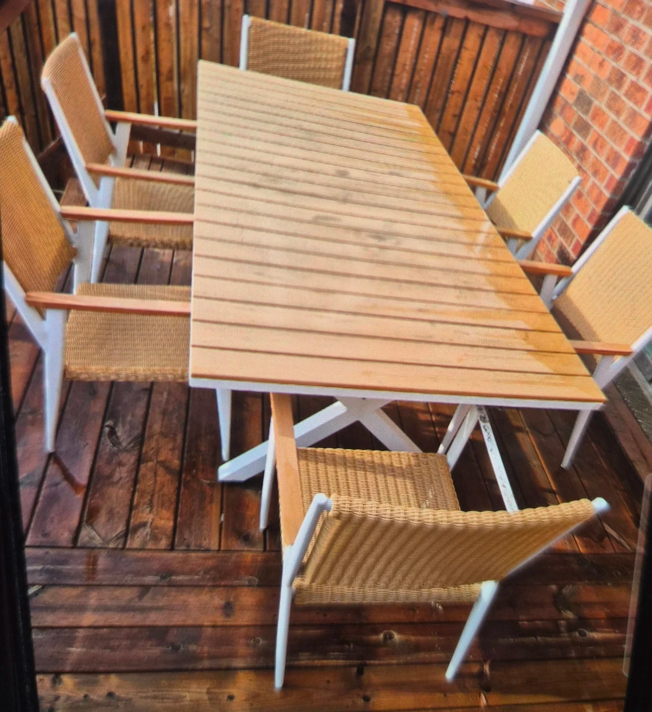 This outdoor dining set includes a slatted wood table and six chairs. The chairs feature woven seats and backs with white frames and wood armrests. Great for enjoying meals on the deck or patio!87"×39"