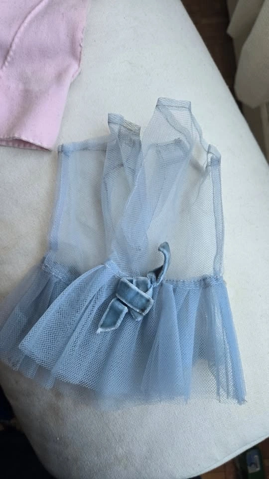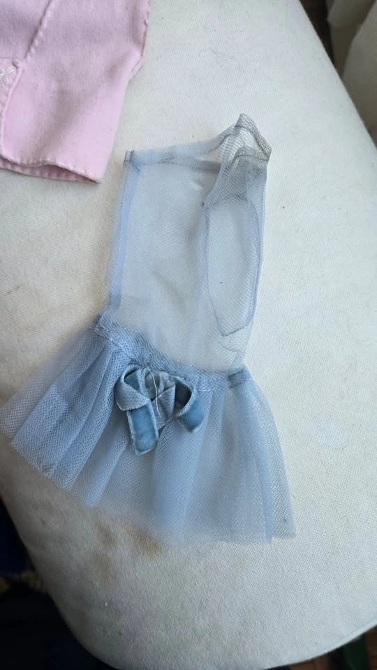 Two pairs of vintage gloves. One pair is pink felt, looks hand-sewn, with a small pink flower on the wrist. The other pair is fingerless blue mesh with a velvet bow and ruffle around the wrist. These are on the small side; they were too small for me (3" palm). Pick up at Queen and John.