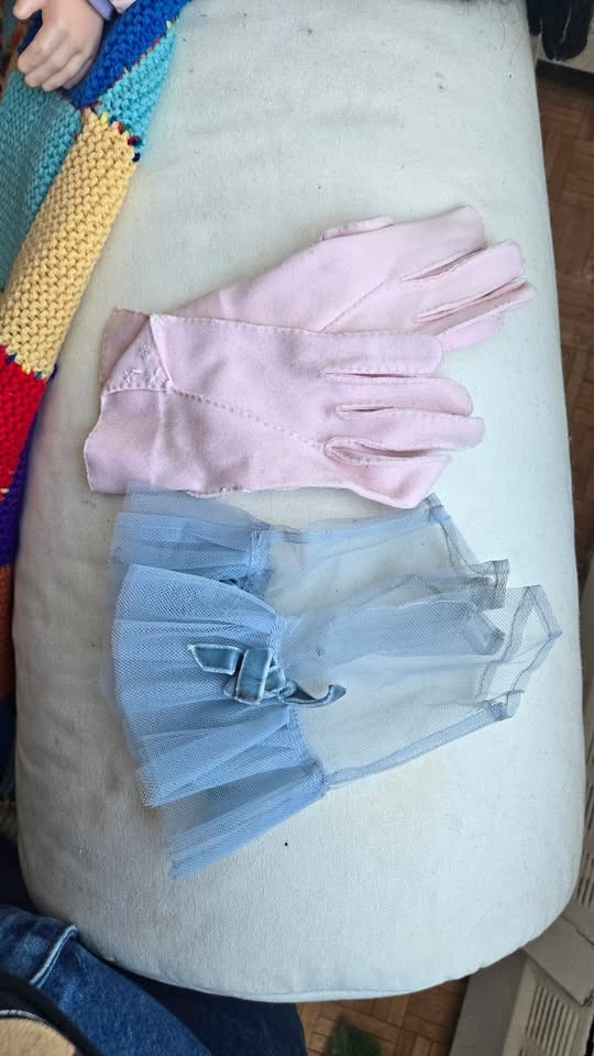 Two pairs of vintage gloves. One pair is pink felt, looks hand-sewn, with a small pink flower on the wrist. The other pair is fingerless blue mesh with a velvet bow and ruffle around the wrist. These are on the small side; they were too small for me (3" palm). Pick up at Queen and John.