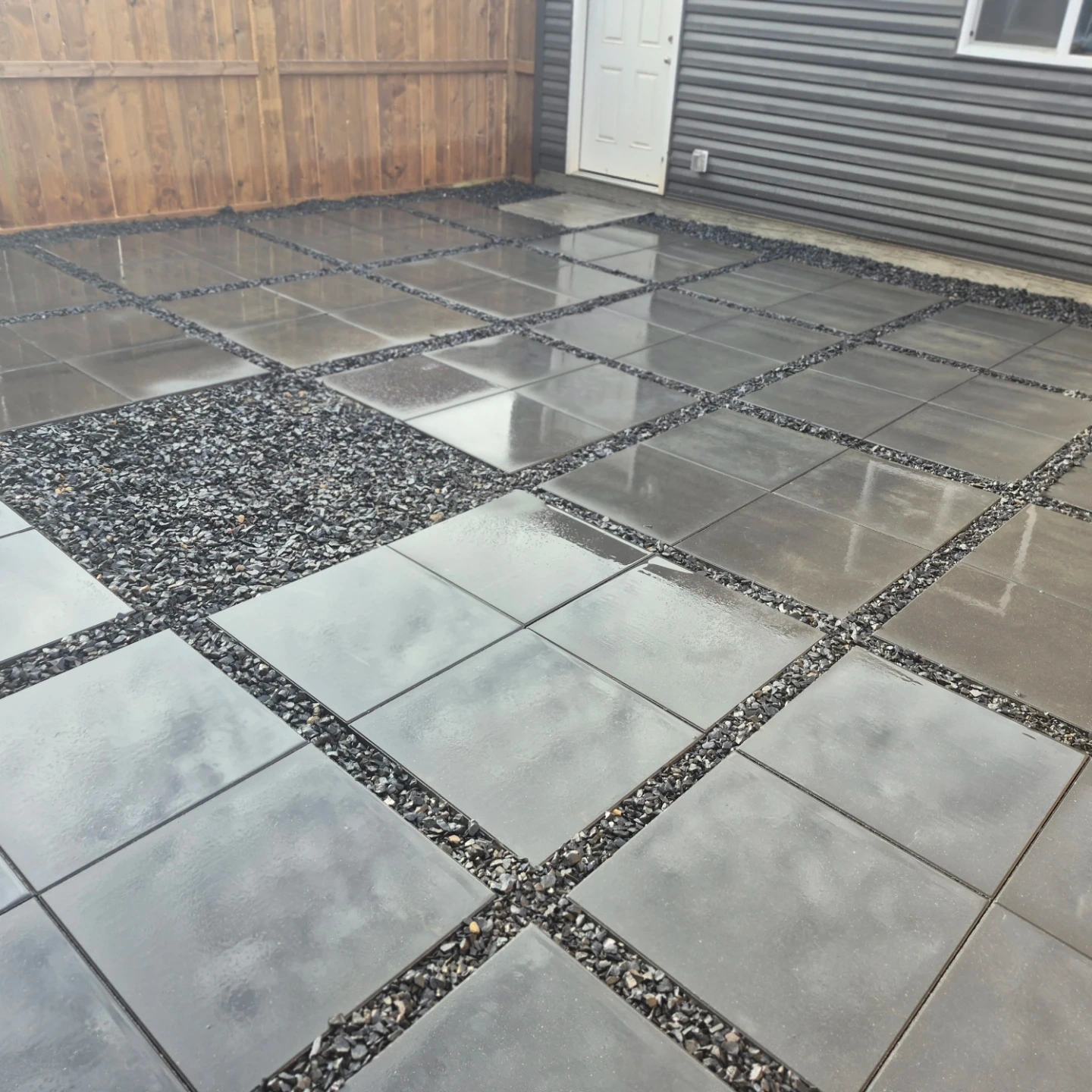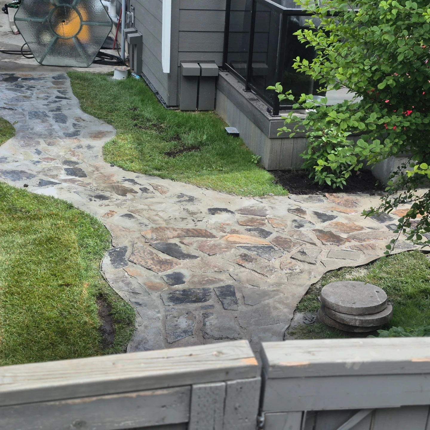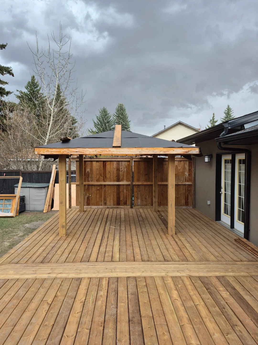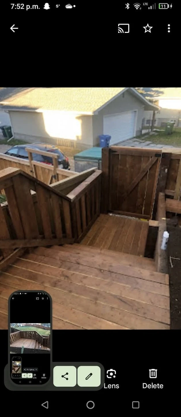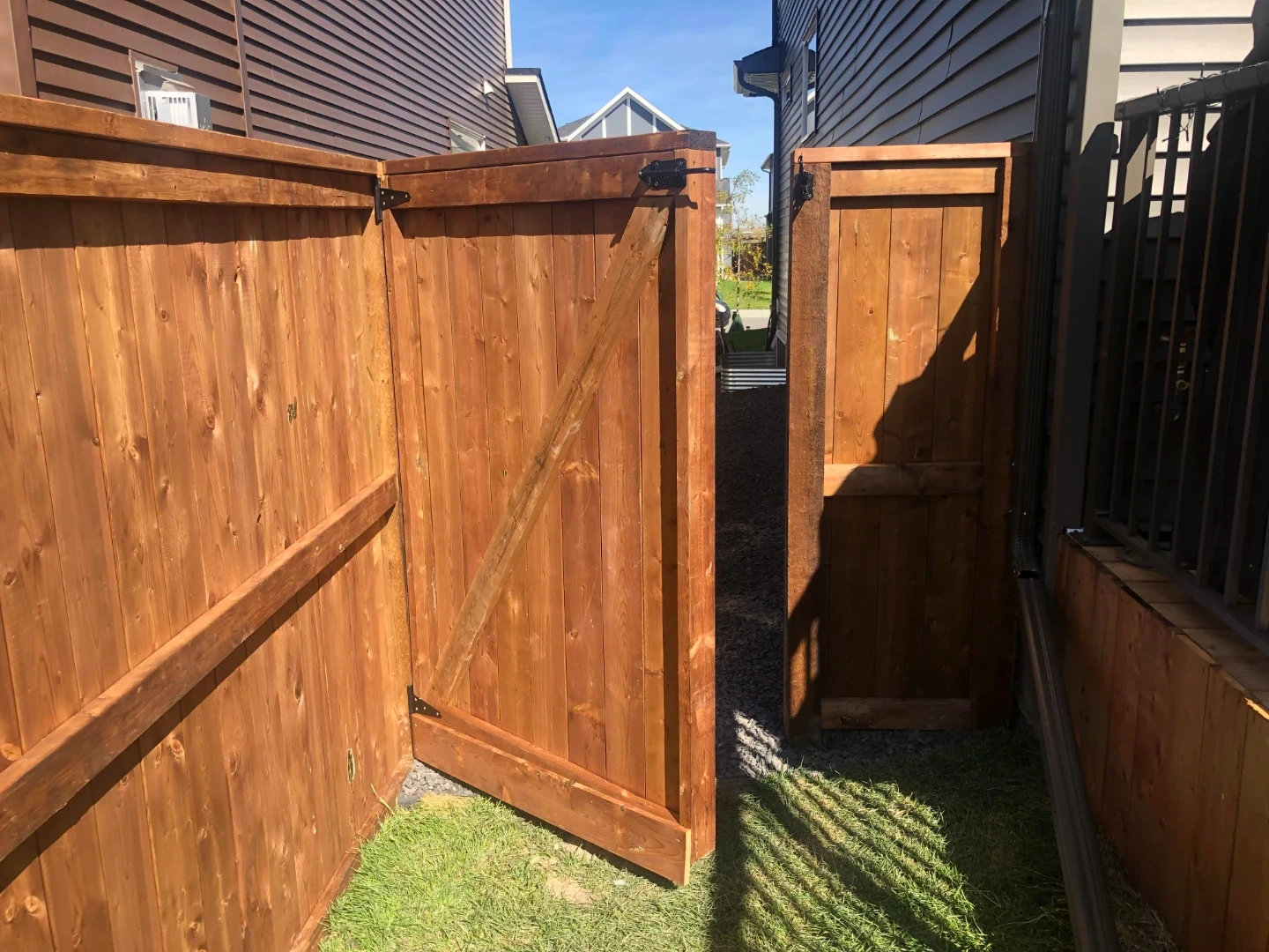 Wooden deck with stairs and railings, and a matching wooden fence with a gate. Made of wood and stained a warm brown colour. Plenty of space for outdoor entertaining or a backyard retreat. This would be great for a new homeowner or someone looking to improve their curb appeal!