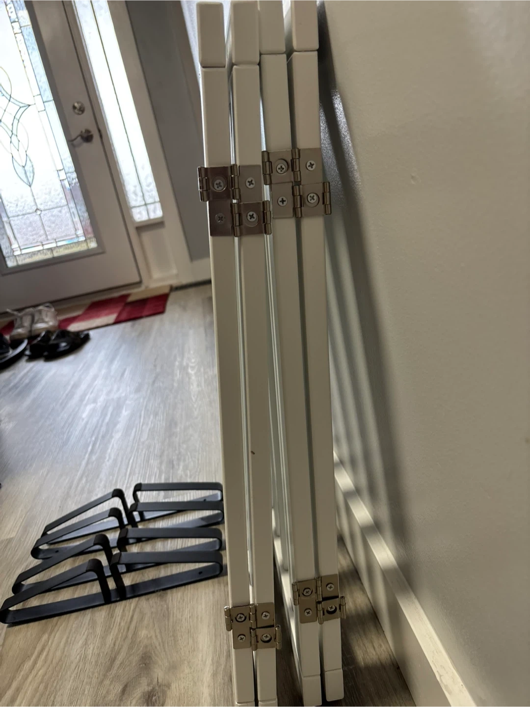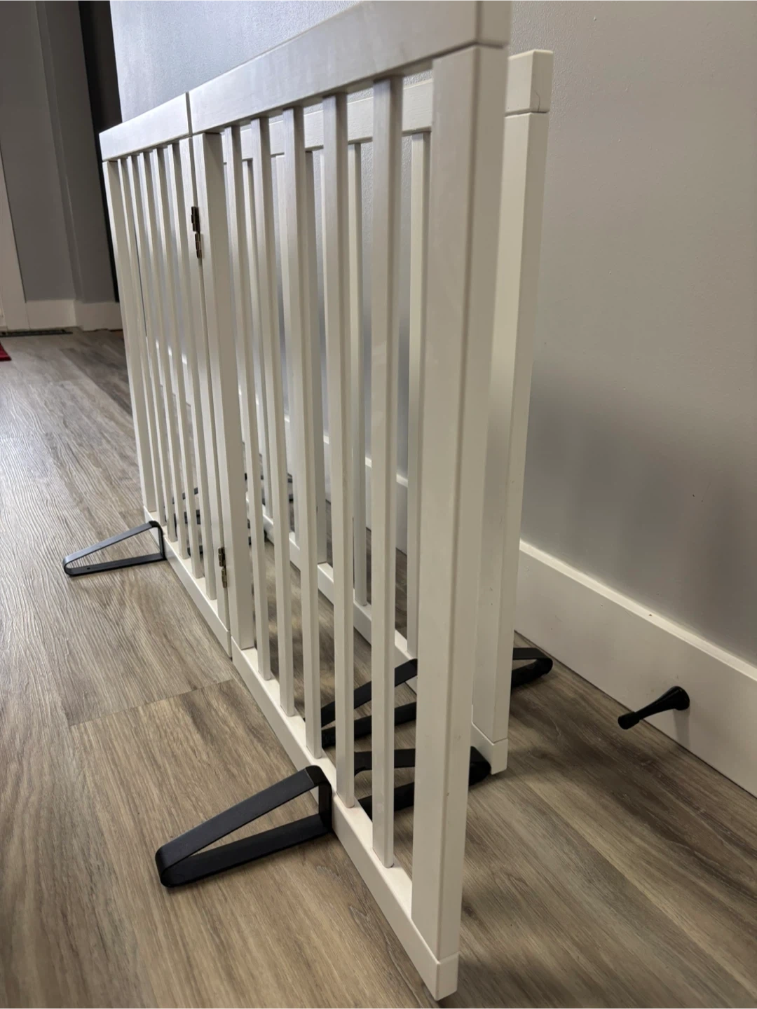 This white wooden baby gate is perfect for keeping little ones safe. It includes multiple metal brackets for secure installation. Easy to set up and adjust for different openings.