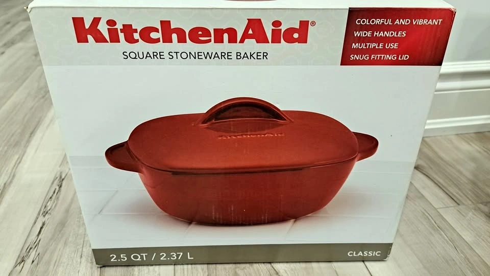 Beautiful red square baking dish with a lid from KitchenAid. It holds 2.5 qt. It's microwave and dishwasher safe. Oven safe up to 500F. Never used and in original box.
