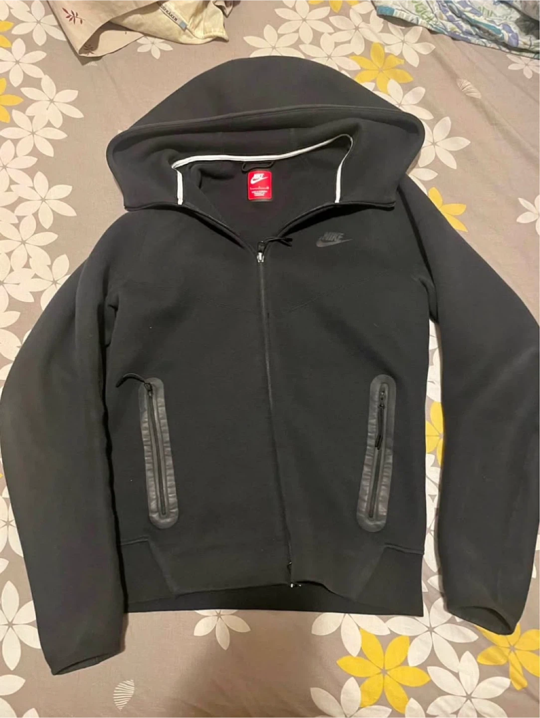 Black Nike Tech Fleece full-zip hoodie. There's a small light stain on the sleeve. That’s the only issue otherwise good condition sweater - pickup around bloor/bathurst