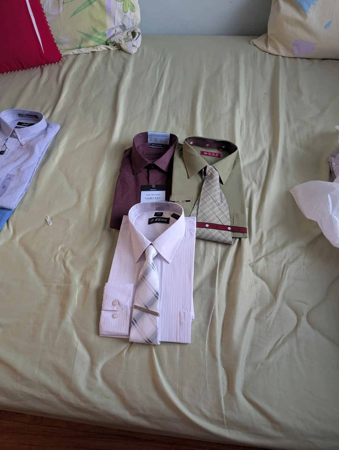 Three men's dress shirts, each with a matching tie included. Two shirts are button-down style, and one has a classic collar. They're in various colours including white, khaki, and burgundy. Ready for your next formal occasion!