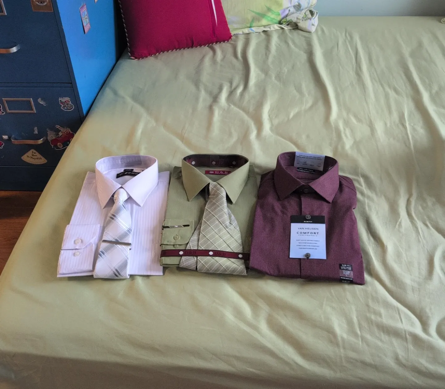 Three men's dress shirts, each with a matching tie included. Two shirts are button-down style, and one has a classic collar. They're in various colours including white, khaki, and burgundy. Ready for your next formal occasion!