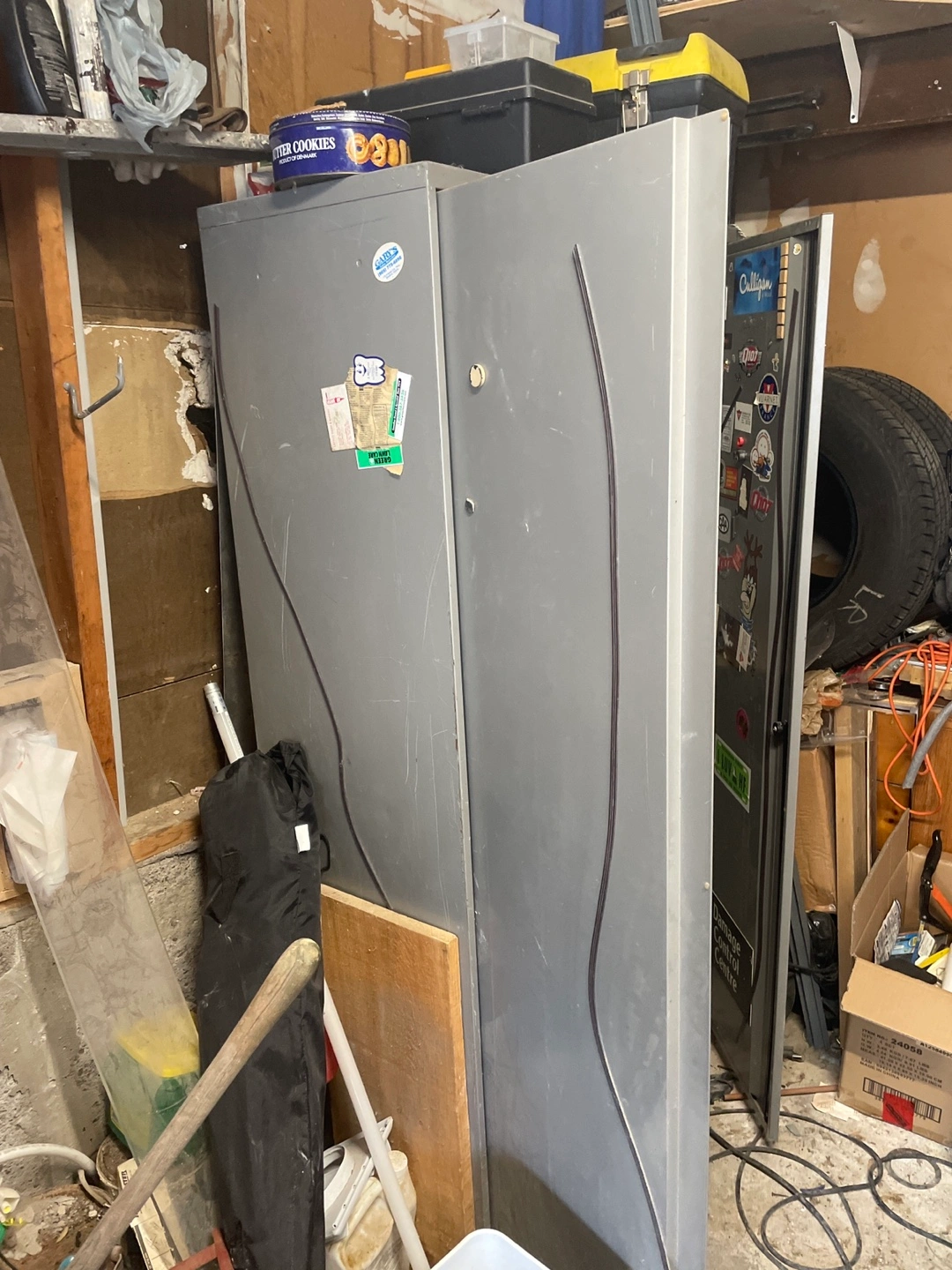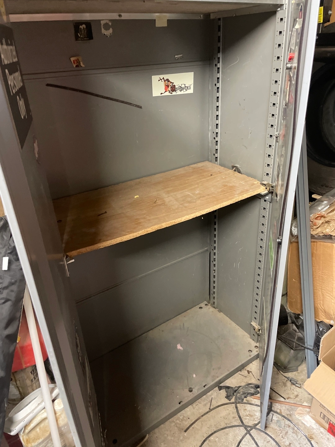 Grey metal cabinet, two doors. Interior shelving. Shows some wear. Great for storage or organization. no rush on it.