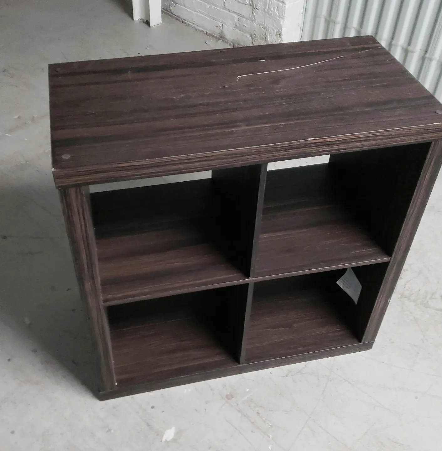 This is a 4-cube storage shelf in a dark wood finish. It's made of particleboard or MDF. The shelf has some visible scratches on the top surface. It's great for organizing books, decor, or other items.