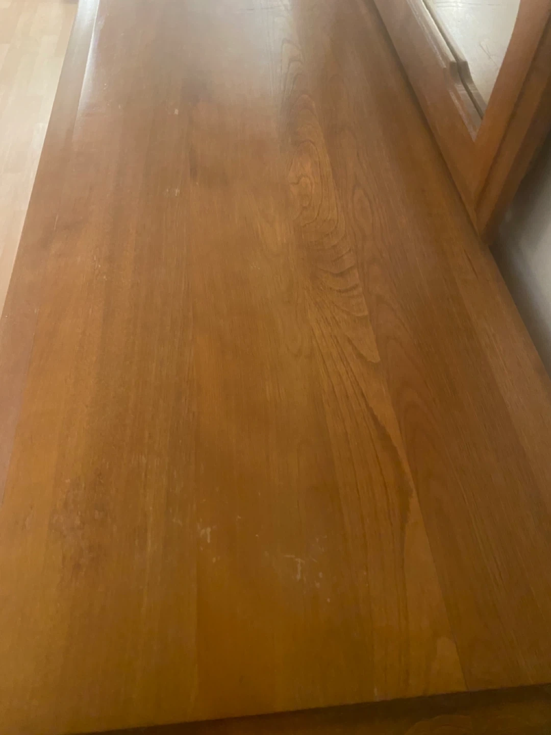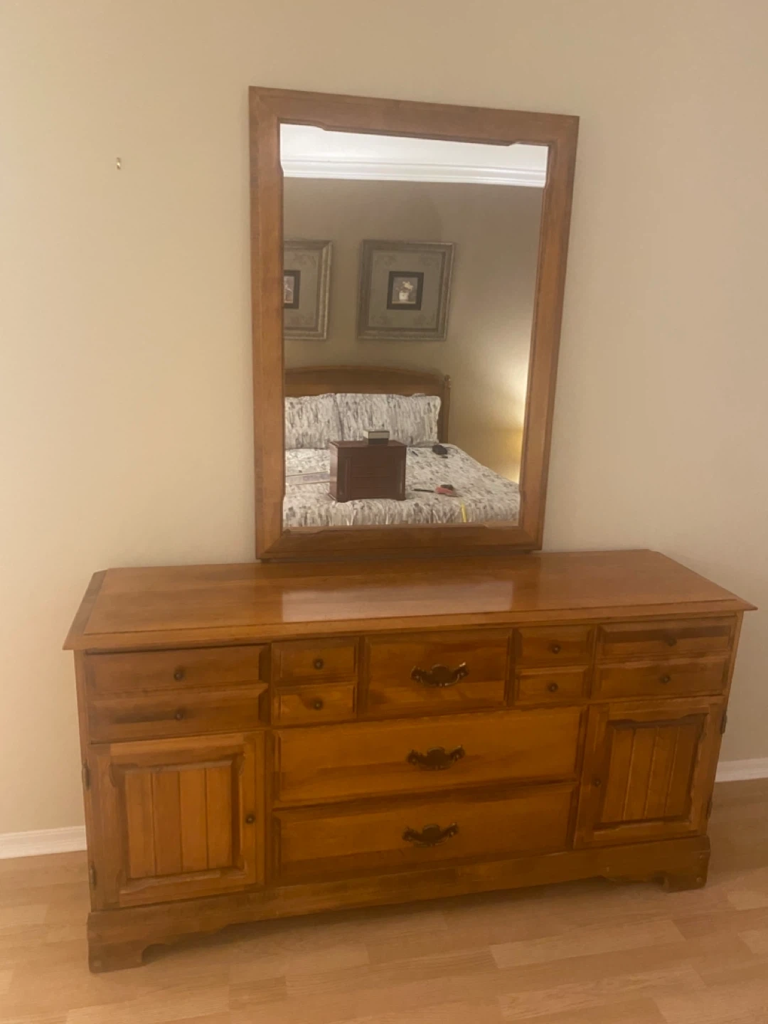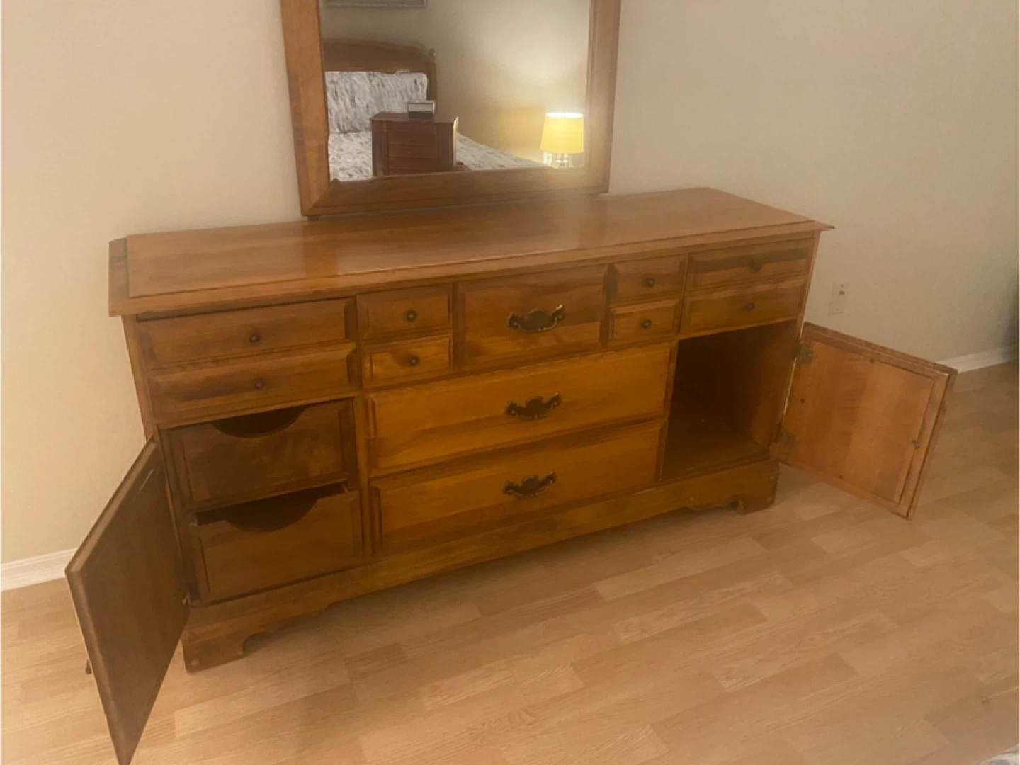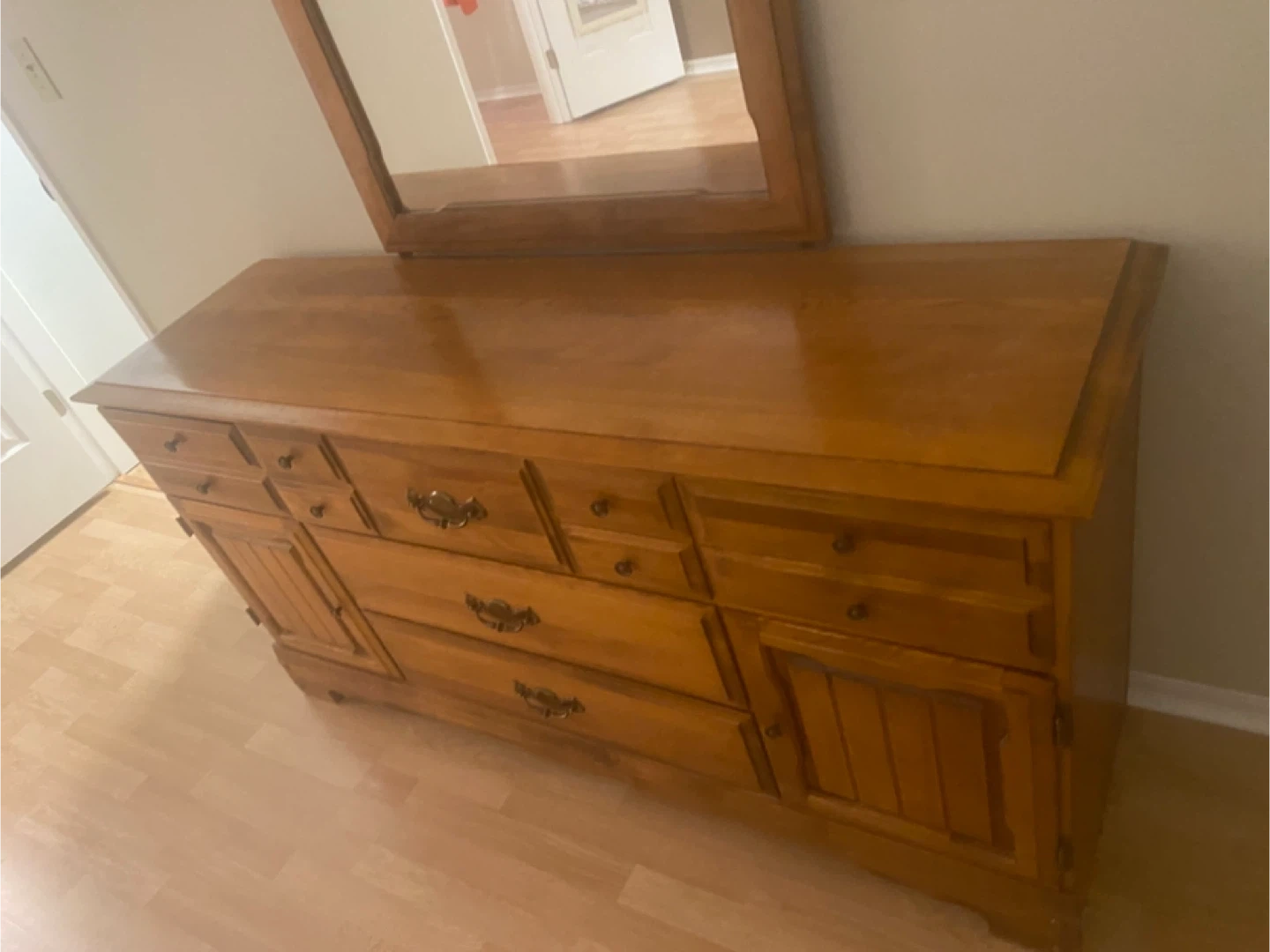 This is a long solid maple wooden dresser with mirror. It has many drawers and cabinet space for storage. The wood has a warm, natural finish. It is in excellent condition with a few minor marks on top. This dresser would be a great addition to any bedroom for organizing clothes and accessories.