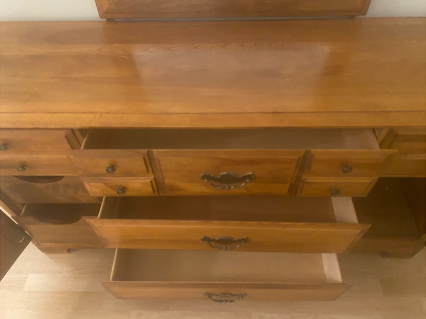 This is a long solid maple wooden dresser with mirror. It has many drawers and cabinet space for storage. The wood has a warm, natural finish. It is in excellent condition with a few minor marks on top. This dresser would be a great addition to any bedroom for organizing clothes and accessories.