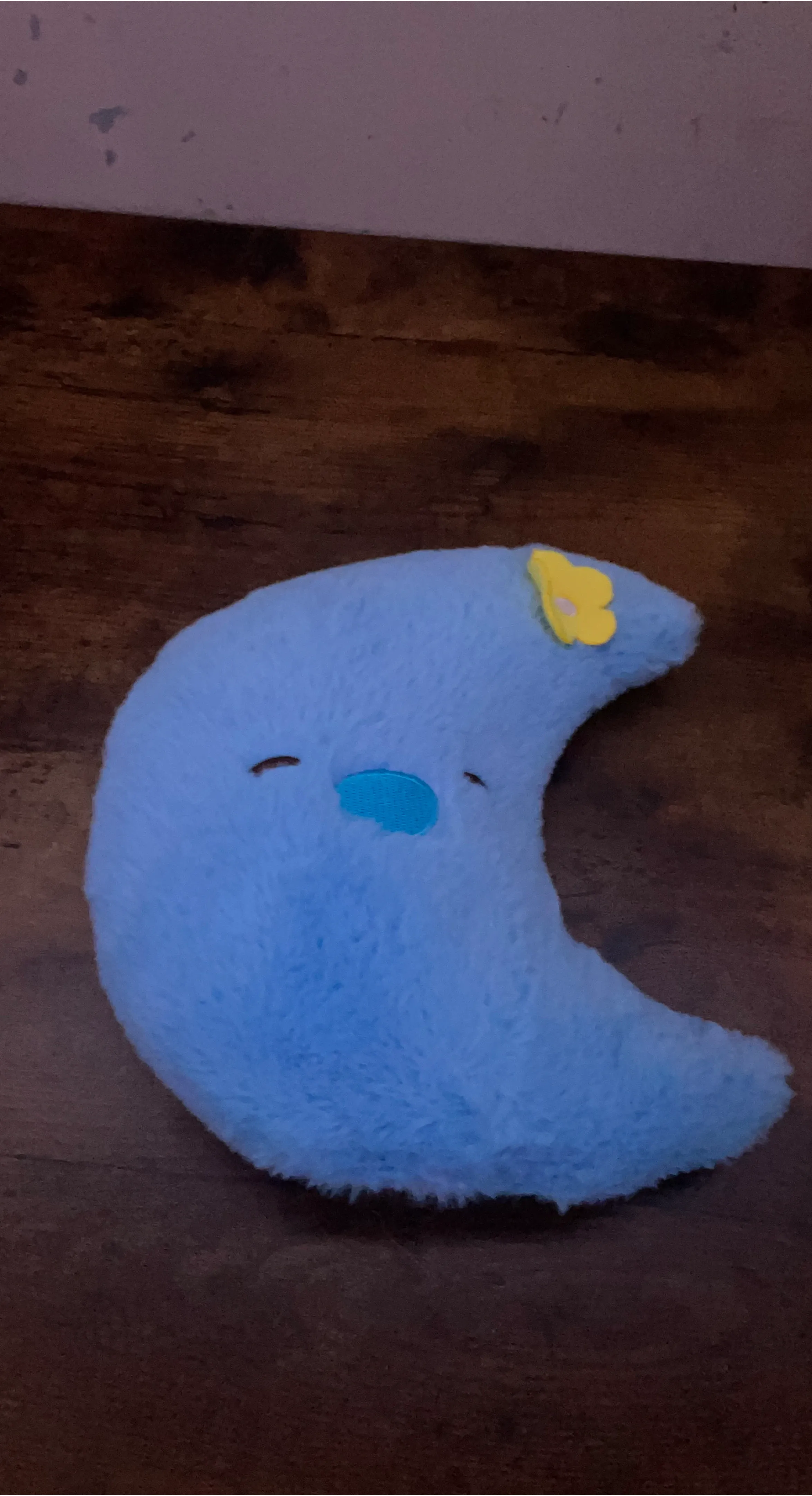 This is a soft, blue plush moon toy with embroidered features and a yellow flower accent. It's made of fluffy material and would be a cute addition to any room.