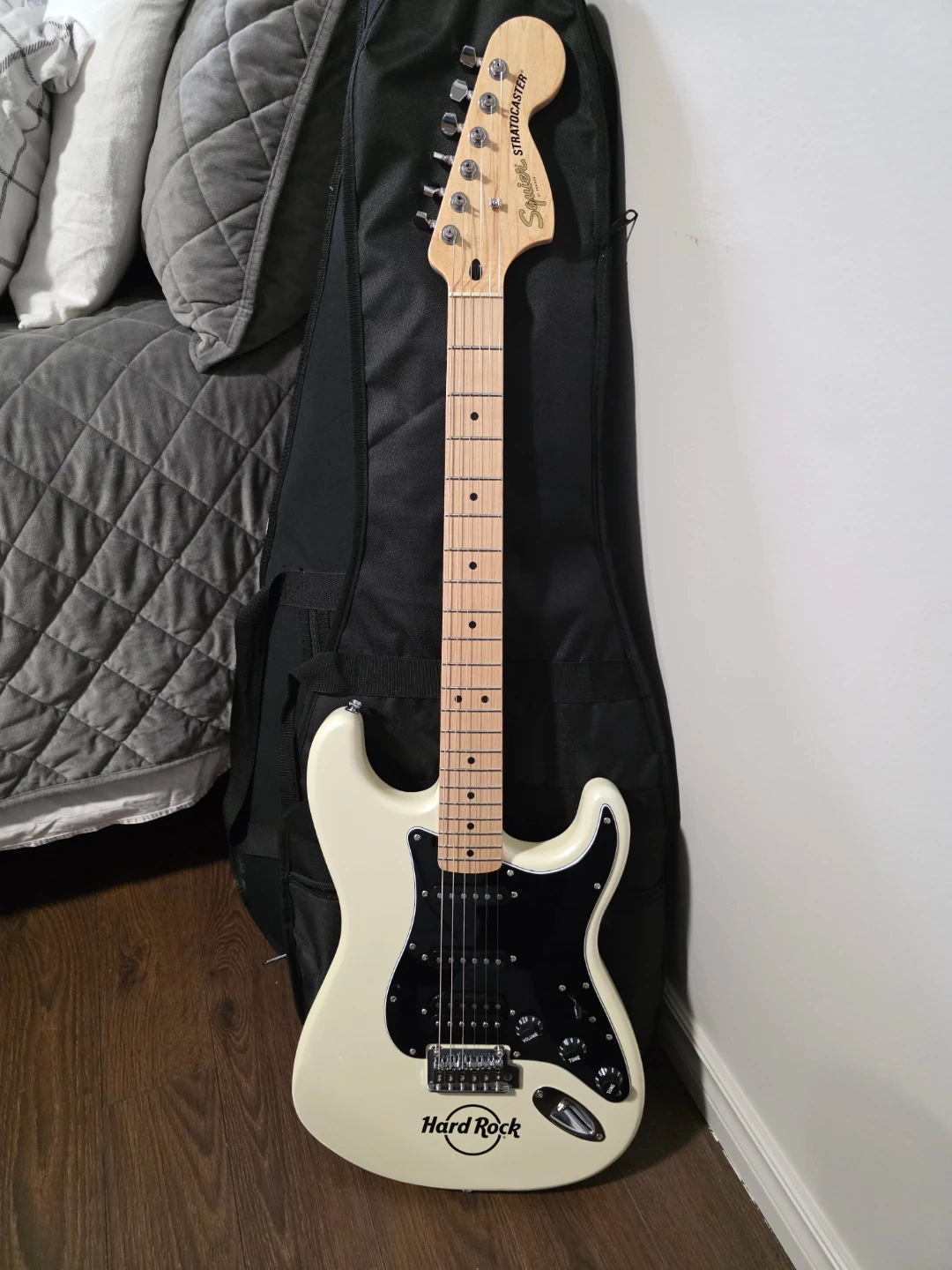 This is a BRAND NEW Fender Squire Affinity Series Hard Rock Stratocaster HSS, in White.