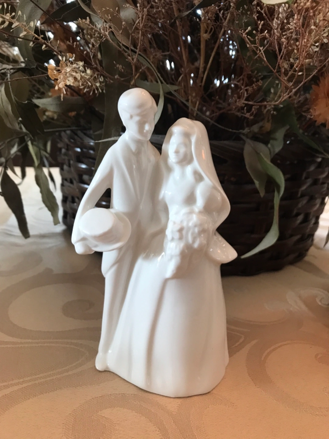 This is a Royal Doulton Images 'Bride and Groom' figurine. It's made of white ceramic. This piece is perfect for a wedding cake topper or anniversary gift!