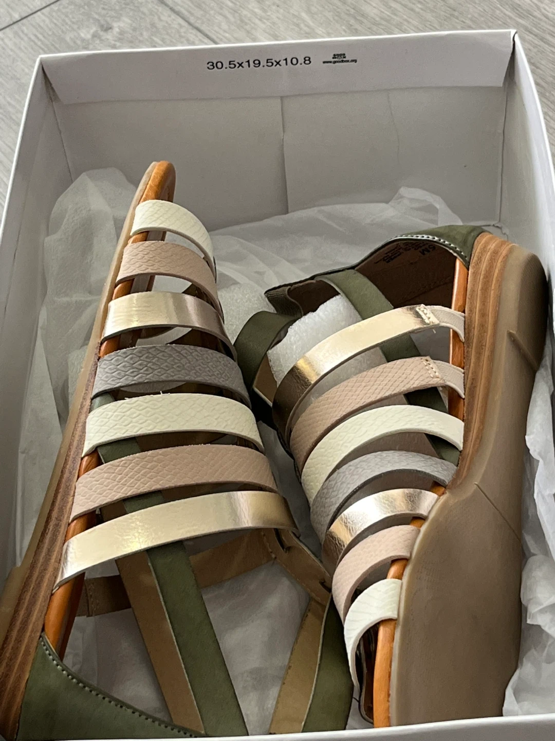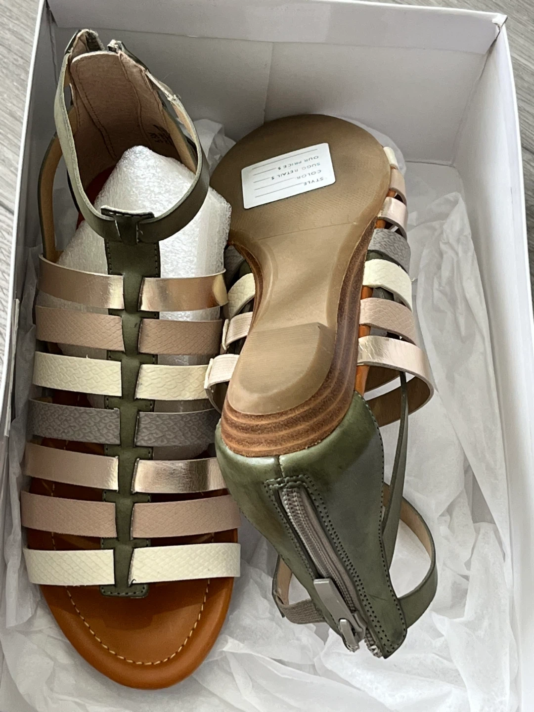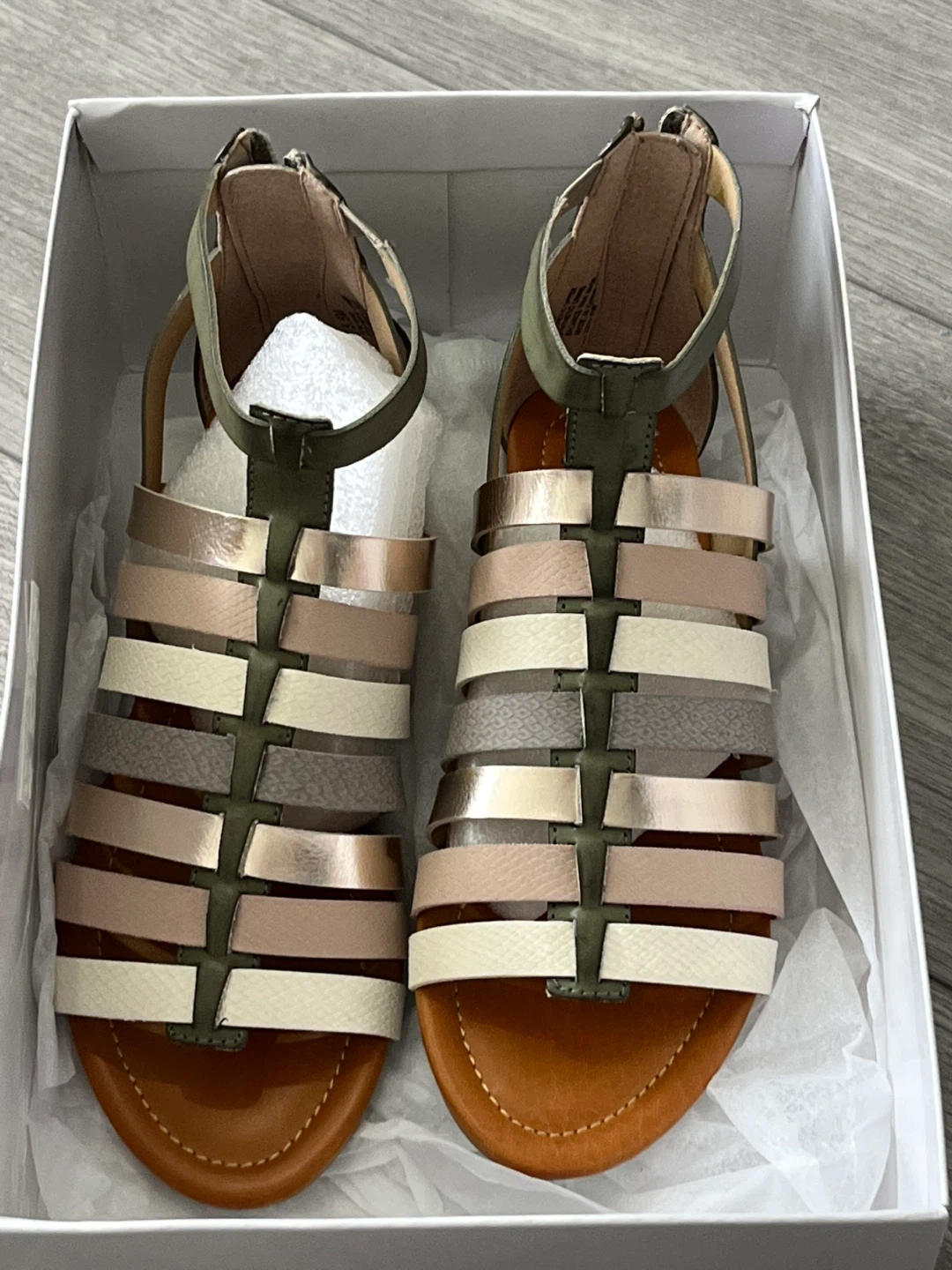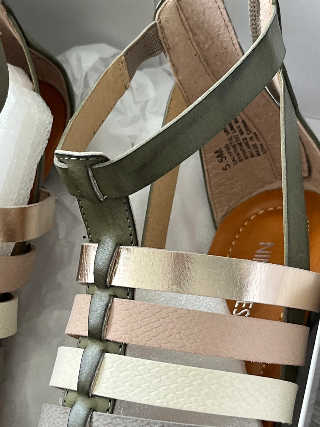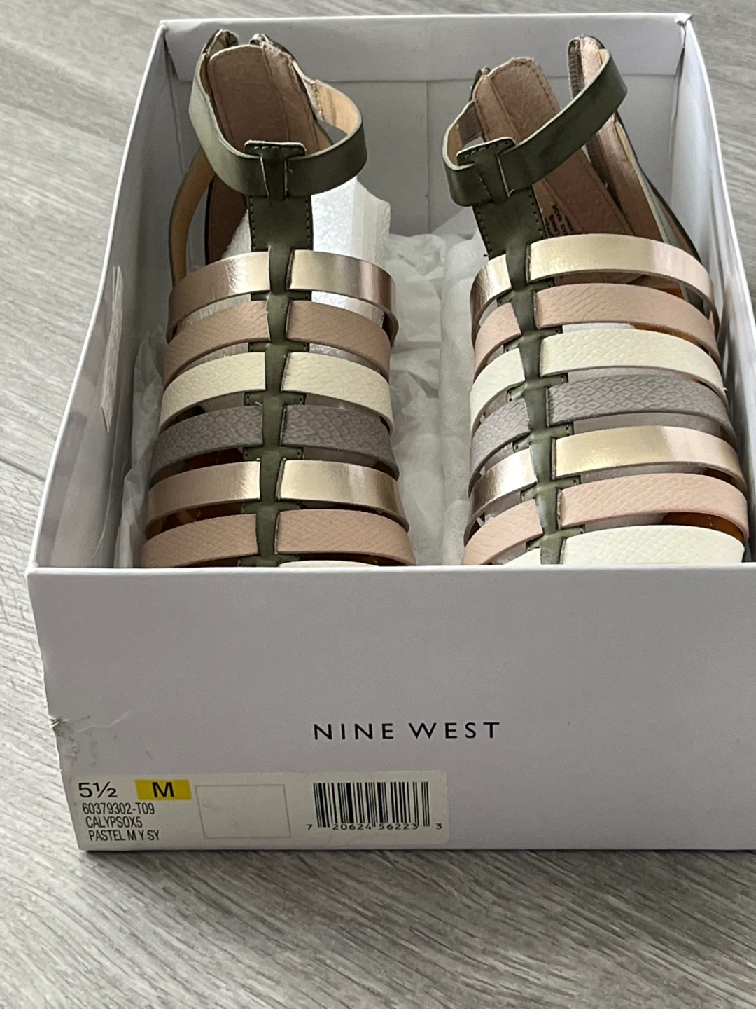 Nine West women's gladiator sandals in a pastel multi-colourway. Features a strappy design with a zip closure at the heel. Material is synthetic. Size is 5.5.