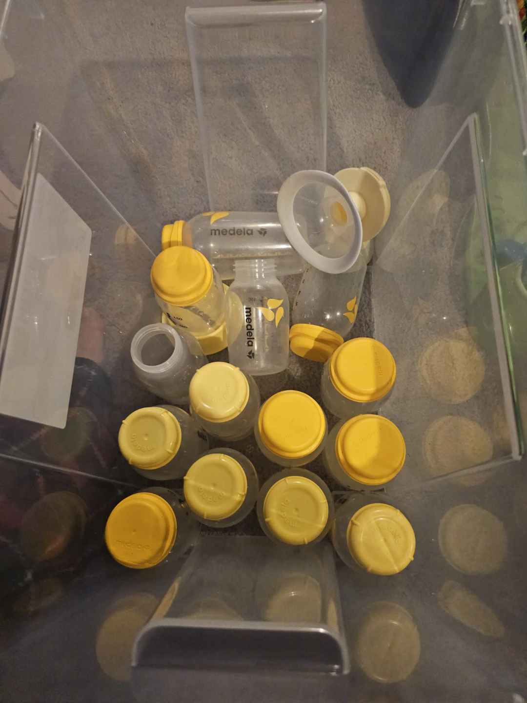 Collection of Medela breast milk storage bottles. Thirteen 5oz and one 9oz bottle. Perfect for storing pumped milk for your little one!