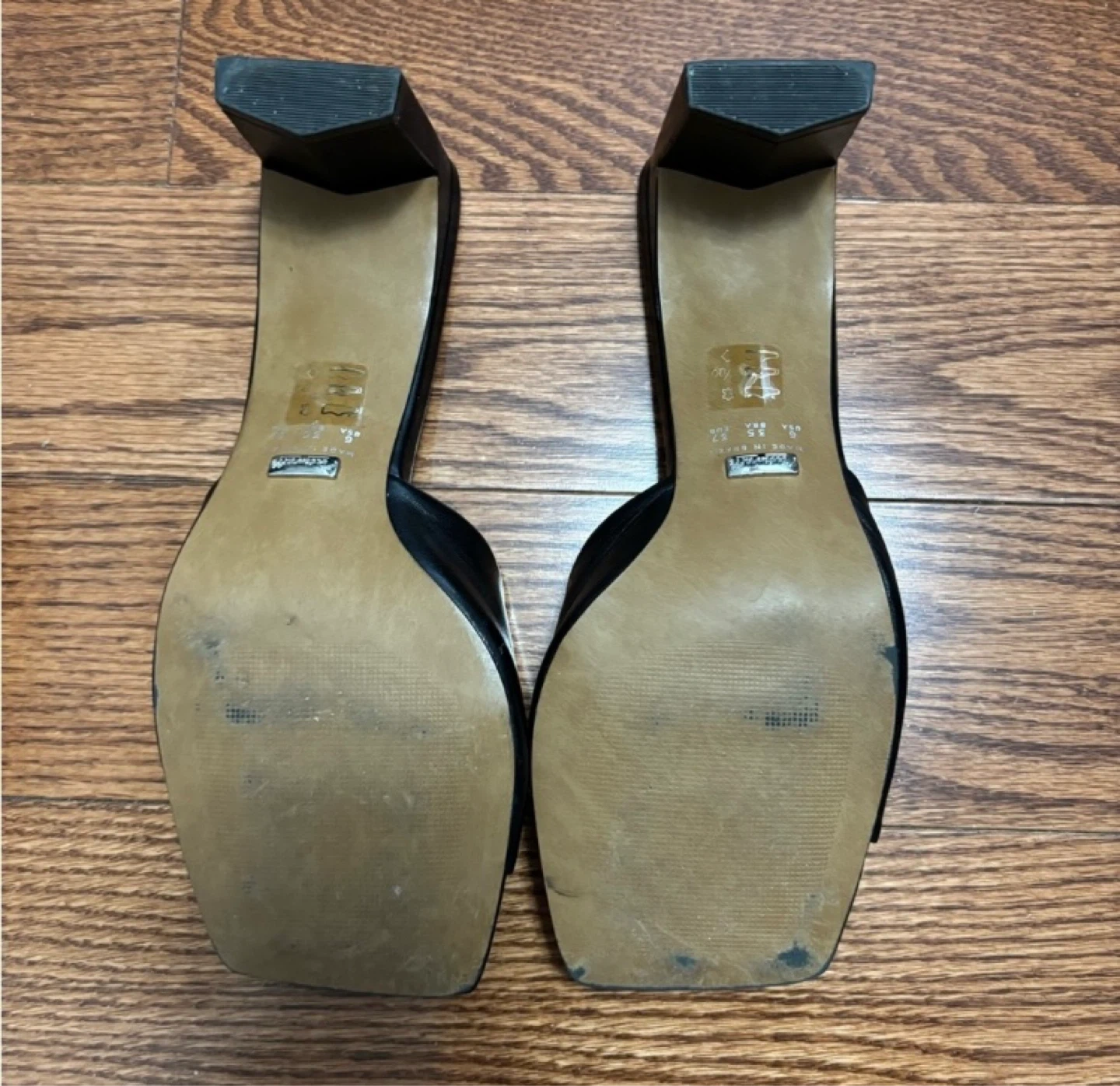 Like new; worn once - sold out in this colour! Selling because I didn’t end up liking the square toe on me. They look very well made. Best for a size 6.5 US, but could also fit a 7. These were made in Brazil, and of genuine leather. They have a 2.5” heel.