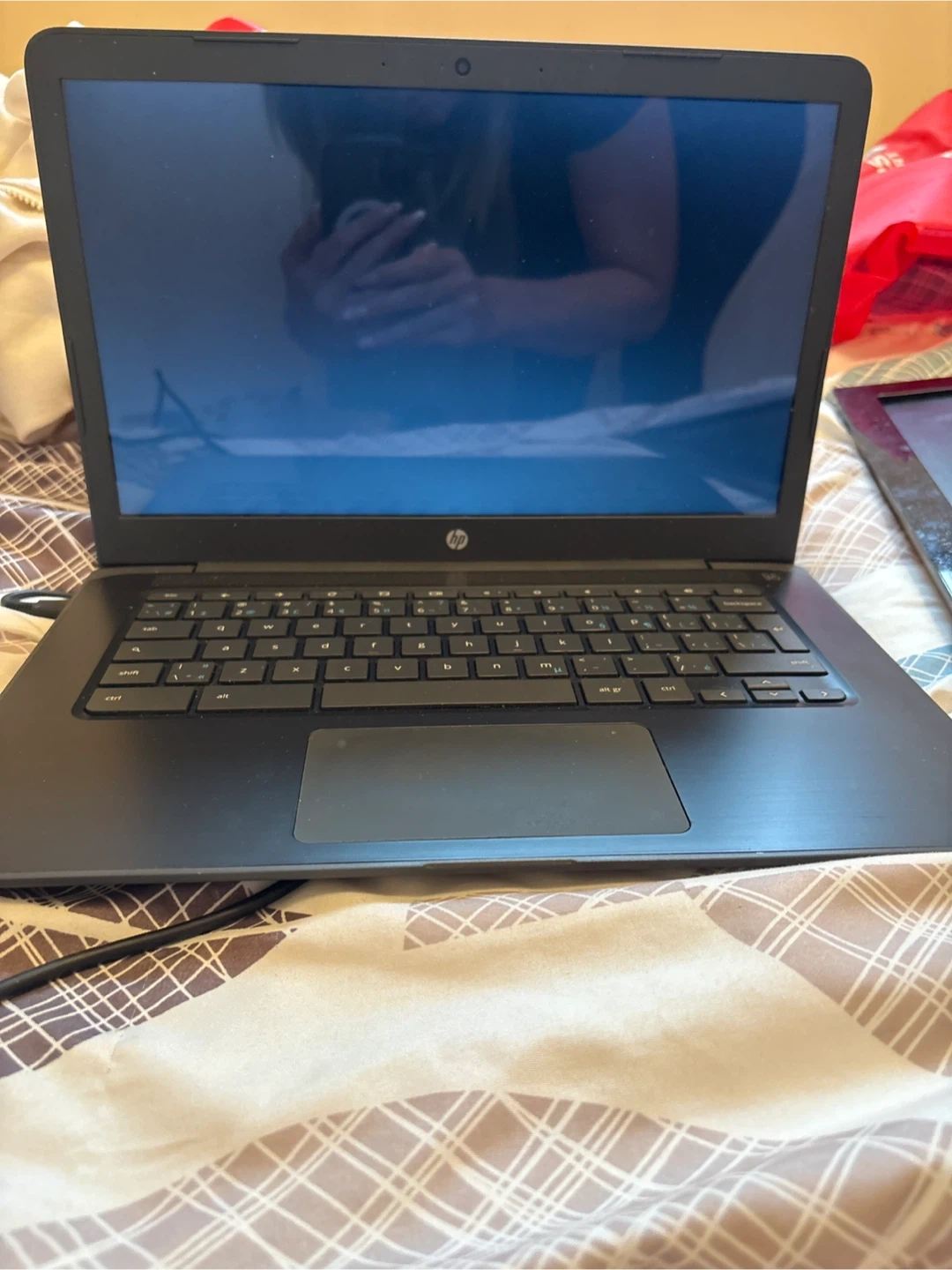 This is an HP laptop. It has a black finish and a standard QWERTY keyboard layout. The screen is black, indicating it's off. It's a functional laptop for everyday tasks.