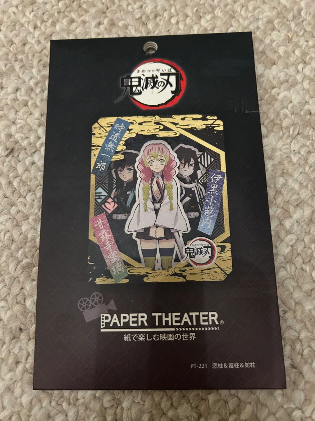 This is a Paper Theater kit featuring characters from Demon Slayer. The kit includes pieces to build a scene with Mitsuri Kanroji, Muichiro Tokito, and Iguro Obanai. It's designed for fans to enjoy the world of Demon Slayer through paper craft.